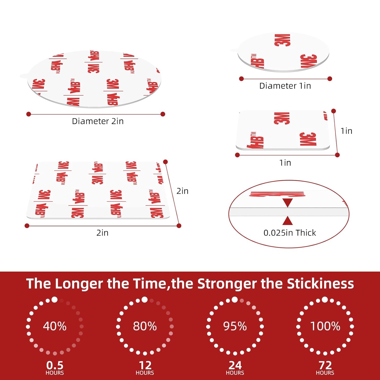 - EASY TO USE: For optimal results, clean the surface thoroughly and ensure it is dry before applying. At room temperature, the adhesive reaches 50% of its maximum strength in 20 minutes, 90% in 24 hours, and 100% in 72 hours. Each round pad includes a small tab for easy peeling, preventing adhesive contamination and simplifying installation.