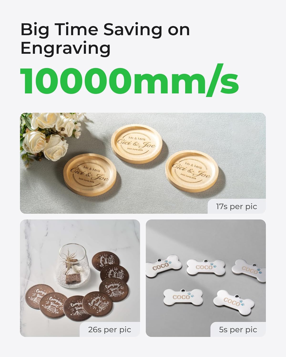 - Support Almost All Materials Ultra-Fast: Introducing the world's first 20W fiber and diode dual lasers, achieving speeds up to 10,000mm/s. The fiber laser can engrave all metals (gold, silver, copper, stainless steel, brass, titanium, etc.) in seconds, while the diode laser excels on wood, acrylic, leather, glass, rubber, fabric, and more.