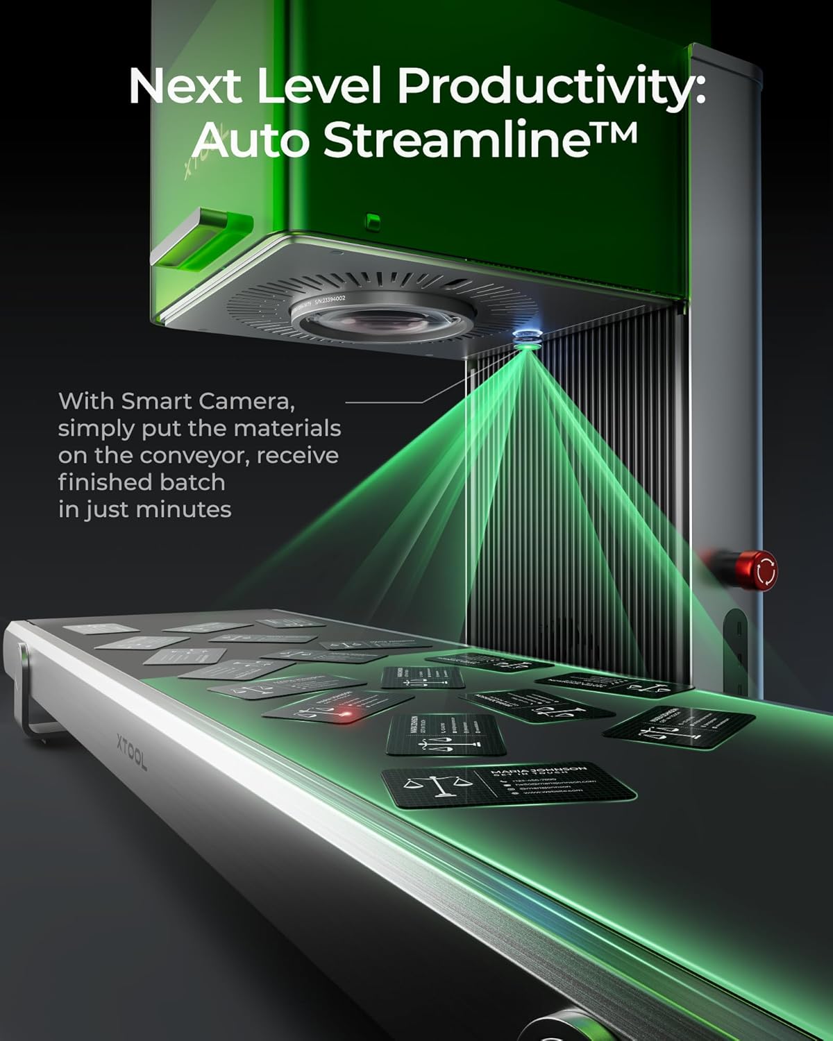- Factory-Level Productivity: xTool's exclusive Auto Streamline Production, powered by the Auto Conveyor (available separately) and a 16MP SMART CAMERA system, effortlessly manages batch engraving. This laser engraver and cutter machine automatically recognizes shapes on the conveyor, intelligently fills patterns on every piece nonstop, and with its 10,000mm/s speed, completes entire batches in minutes.
