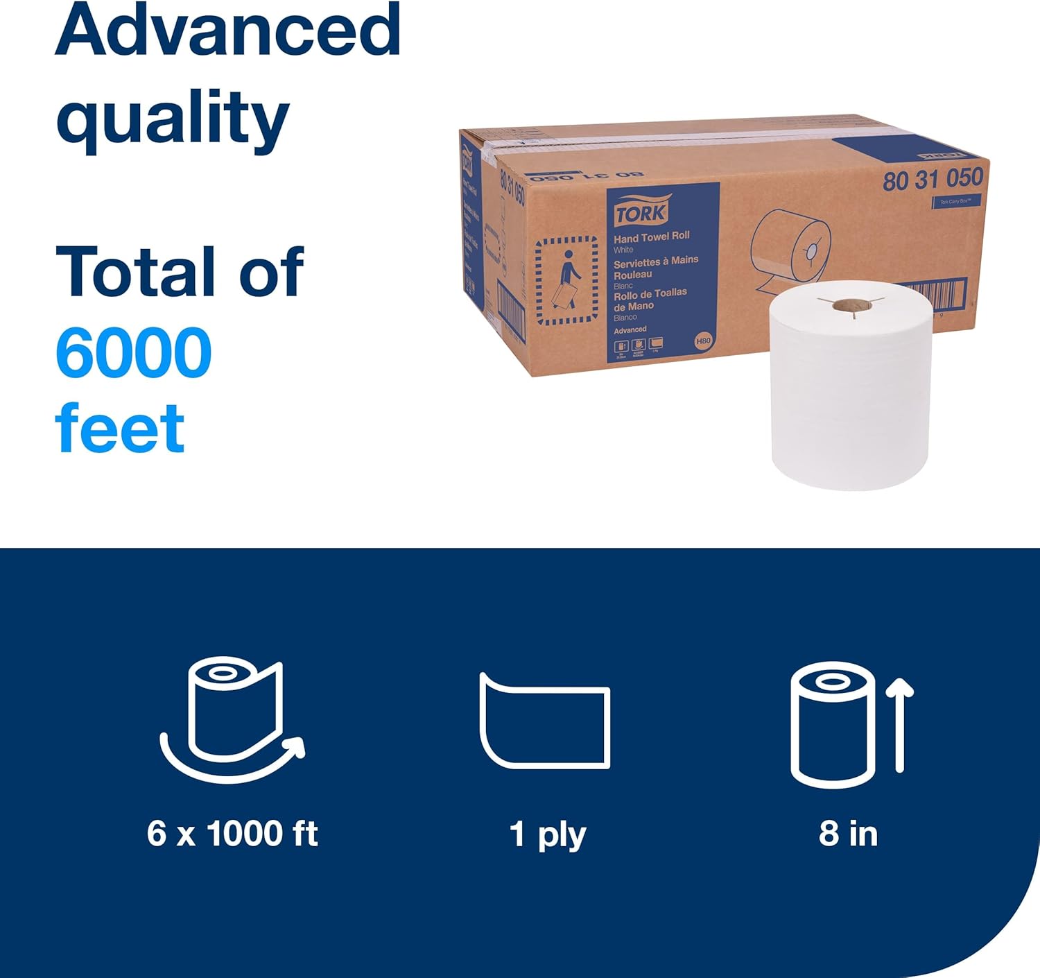 Tork Hand Towel Roll White H80, Advanced, High Absorbency, 6 Rolls x 1000 ft, 8031050