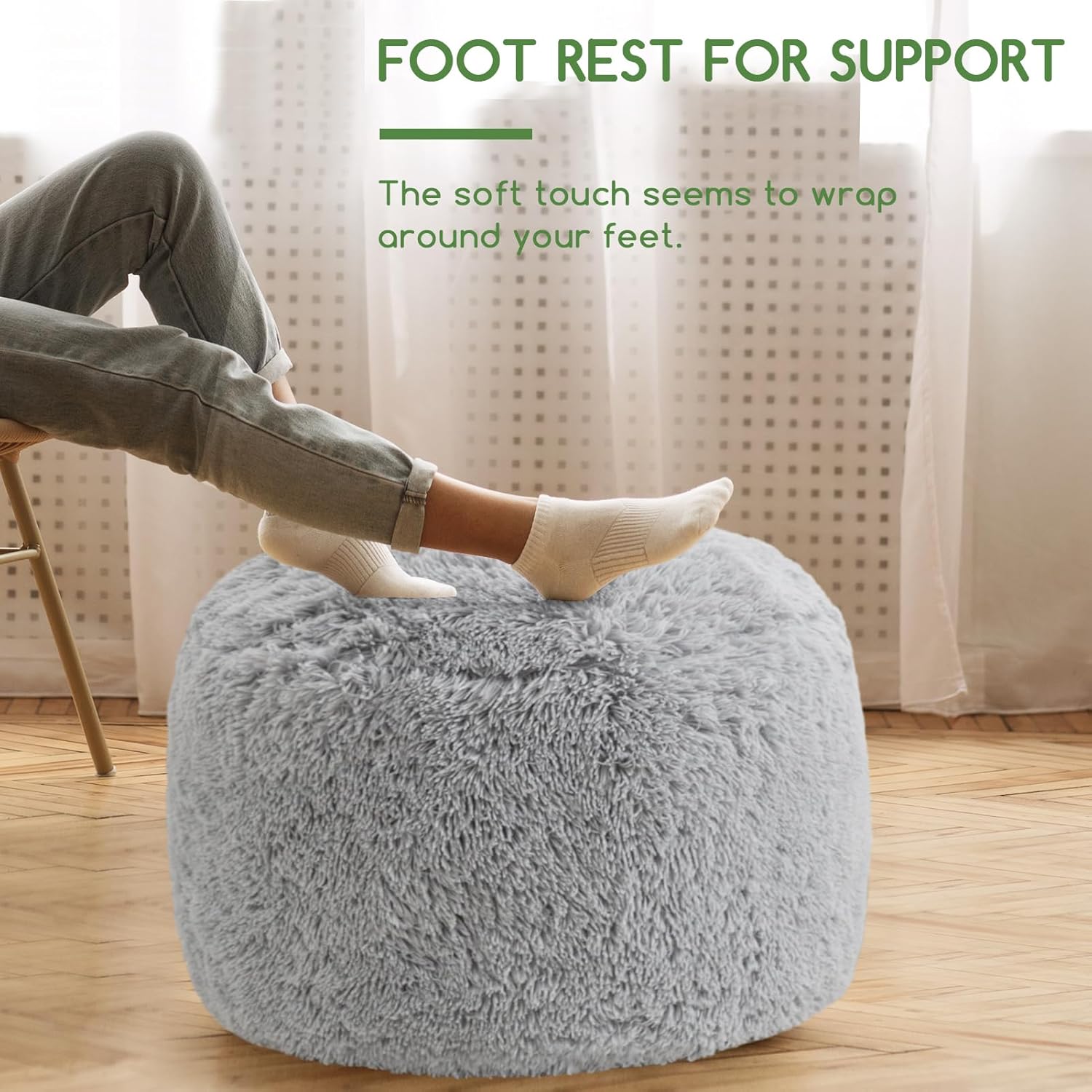 HIGOGOGO Round Stuffed Pouf Ottoman, Long Faux Fur Poufs with Foam Chunk Filling, Fluffy and Furry Pouf Foot Stool Storage Ottoman, 26 X 18 Floor Poufs Foot Rest for Living Room, Light Grey