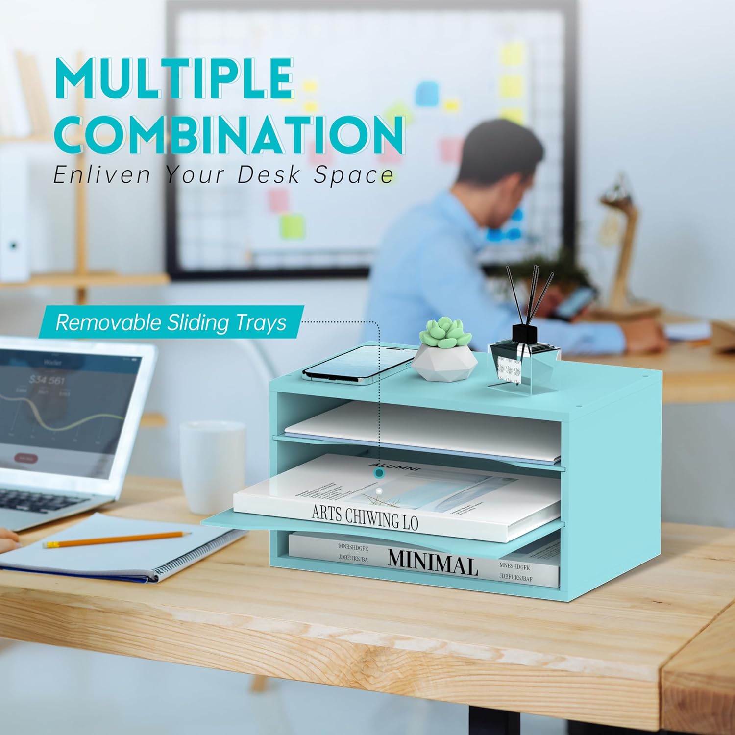 SUPEASY Wood Desk Organizer, 3 Tier Paper File Organizer for Desk, Wooden Desktop Organizer, Paper Letter Literature Mail Sorter, for Office School & Home Organization, Blue