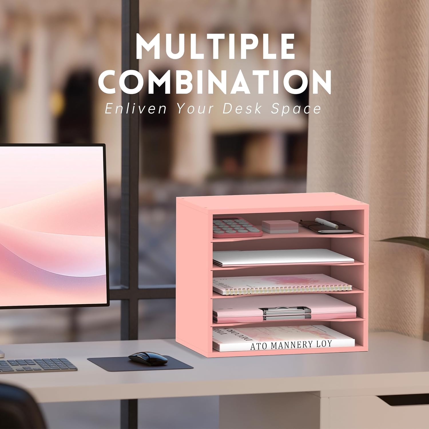 SUPEASY Wood Desk Organizer, 5 Tier Paper File Organizer for Desk, Wooden Desktop Organizer, Paper Letter Literature Mail Sorter, for Office School & Home Organization, Pink