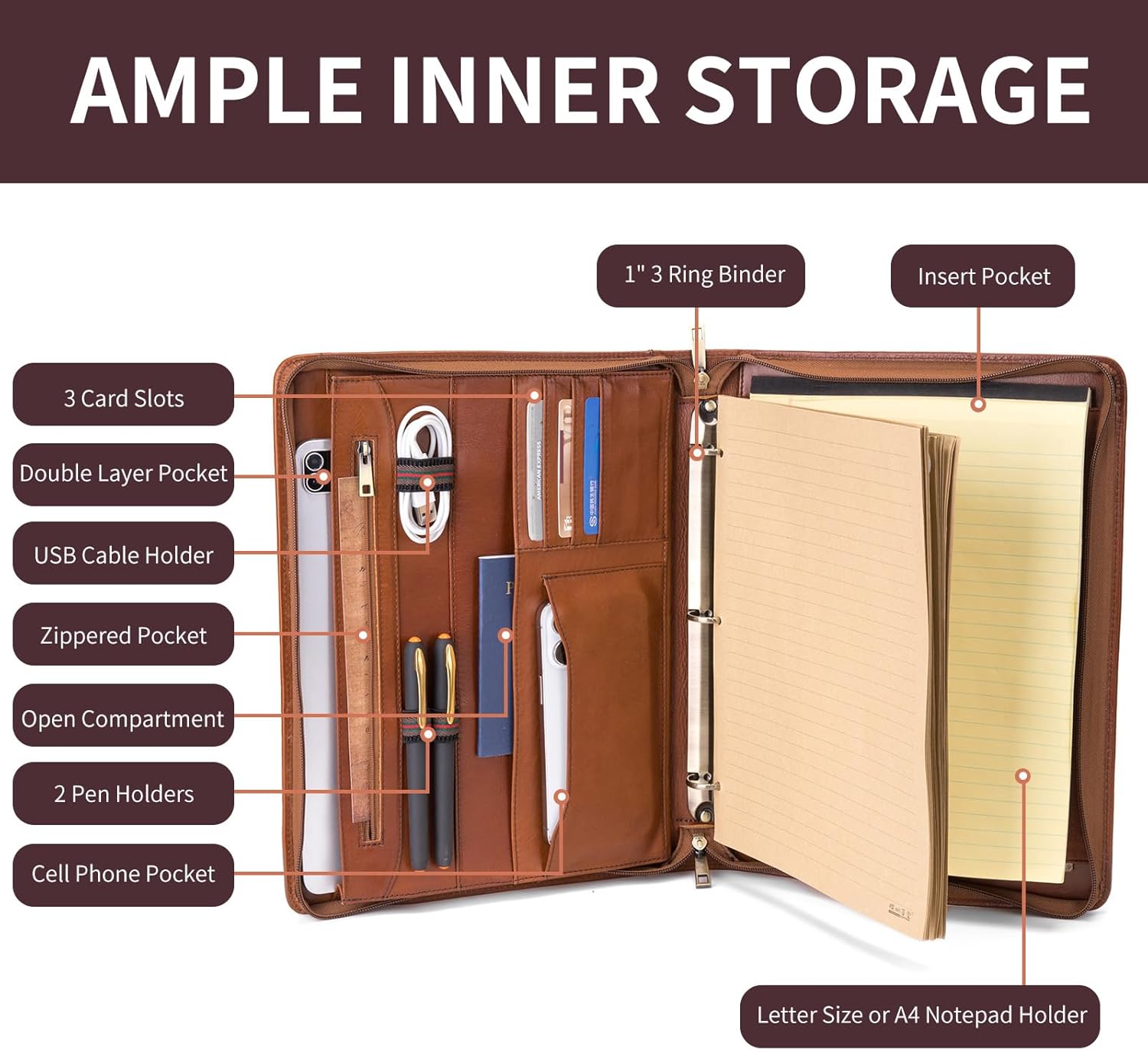 - 3-Ring Binder: Equipped with a robust 3-ring binder mechanism, this leather portfolio ensures secure storage and easy organization of your documents. Perfect for professionals on the go, it accommodates standard-sized sheets and is ideal for meetings, presentations, and everyday use. Enjoy the convenience of flipping through pages effortlessly while maintaining a polished, organized appearance.