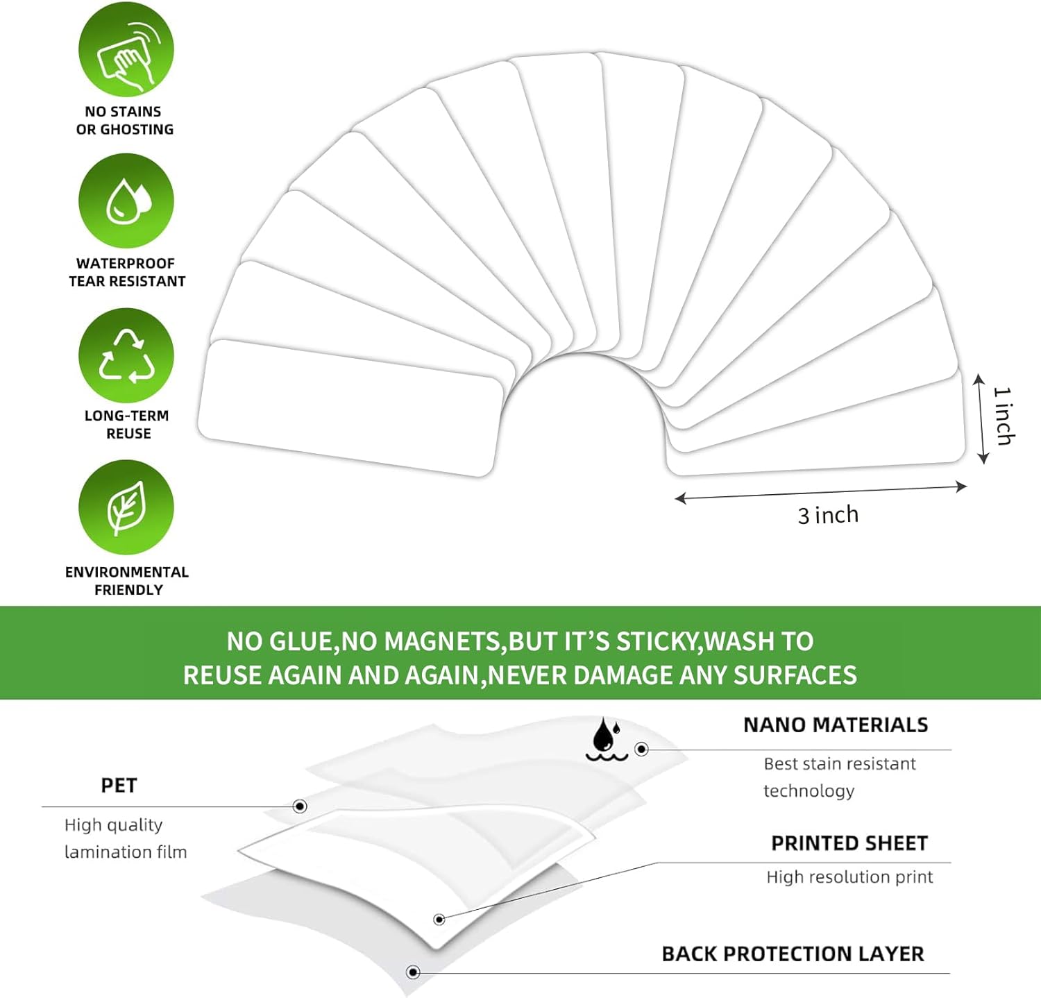- Reusable Label stickers with strong adhesive to stick firmly, but will peel away cleanly and easily when needed, each label can be use up 10,000 times, just wash to renew if get dirty or stickless