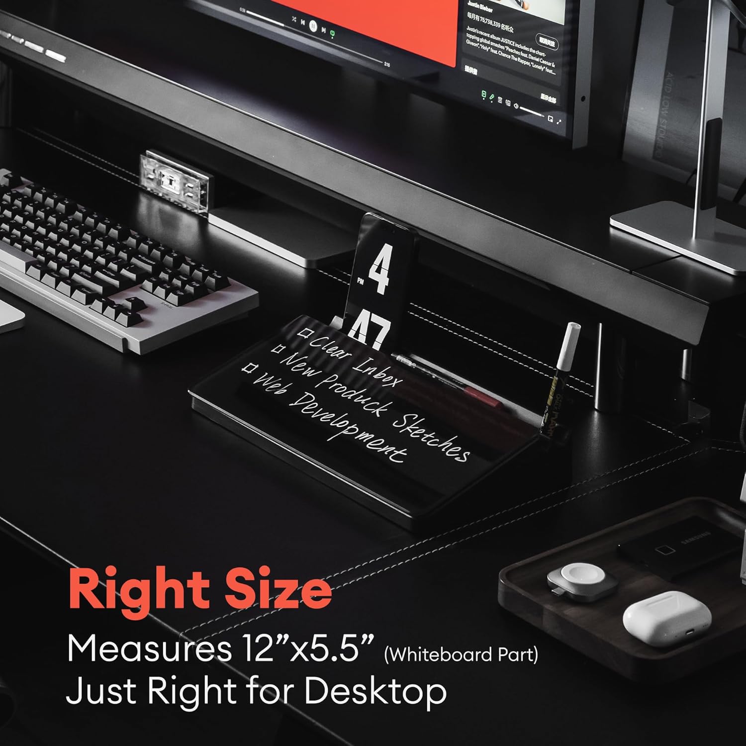 - Polished Design Details: Featuring a built-in phone slot and marker tray, this thoughtfully designed whiteboard keeps your accessories handy. The buffer pad and silicone footpads protect the glass board and your desktop