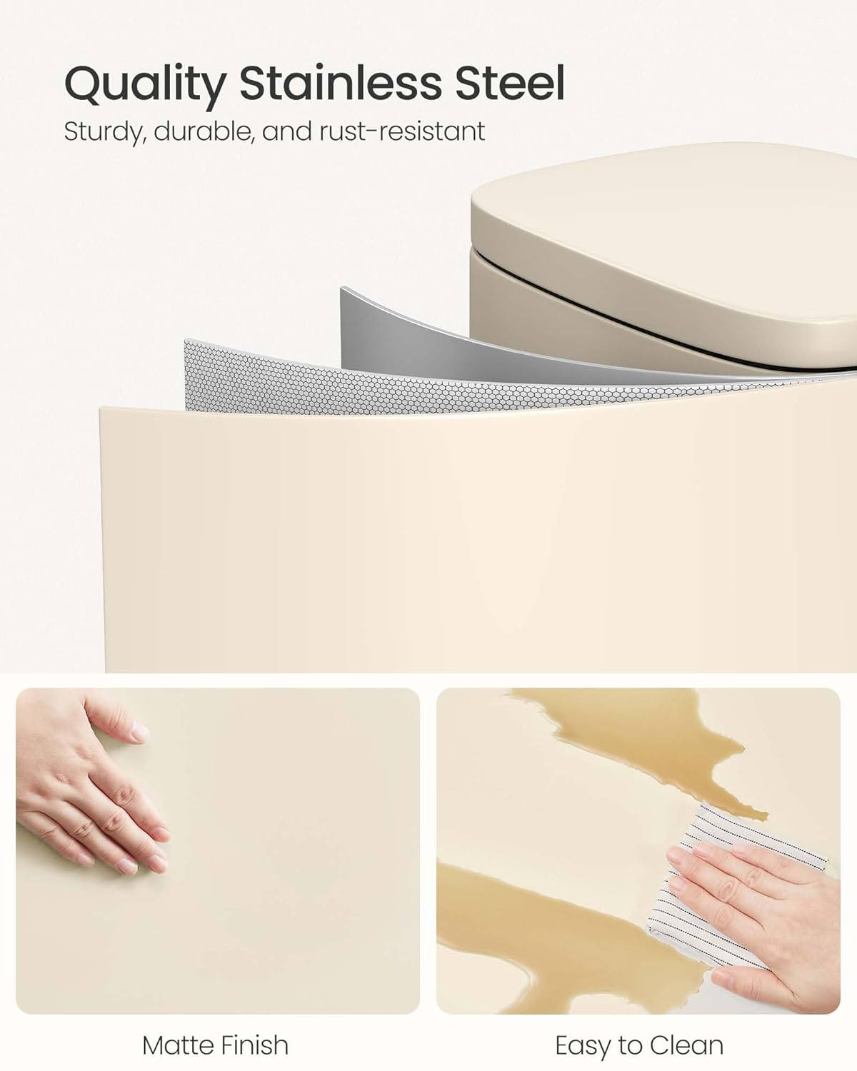 - [Quality Stainless Steel] Stainless steel construction makes this garbage can rust and fingerprint resistant. A simple wipe with a damp cloth keeps it clean and smudge free