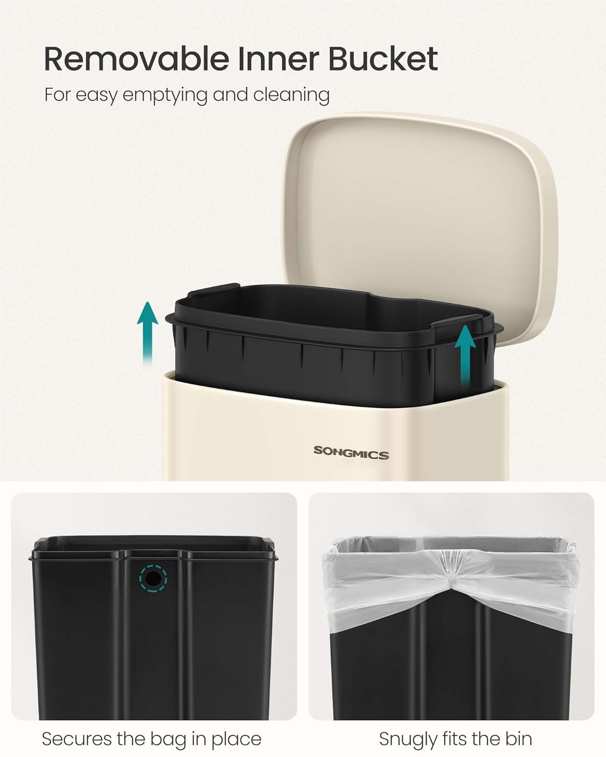 - [Hidden Conveniences] The trash bag can be secured in place by tucking the bag edges into the back hole of the removable inner bucket. When needed the back handle can be used to move the bin around