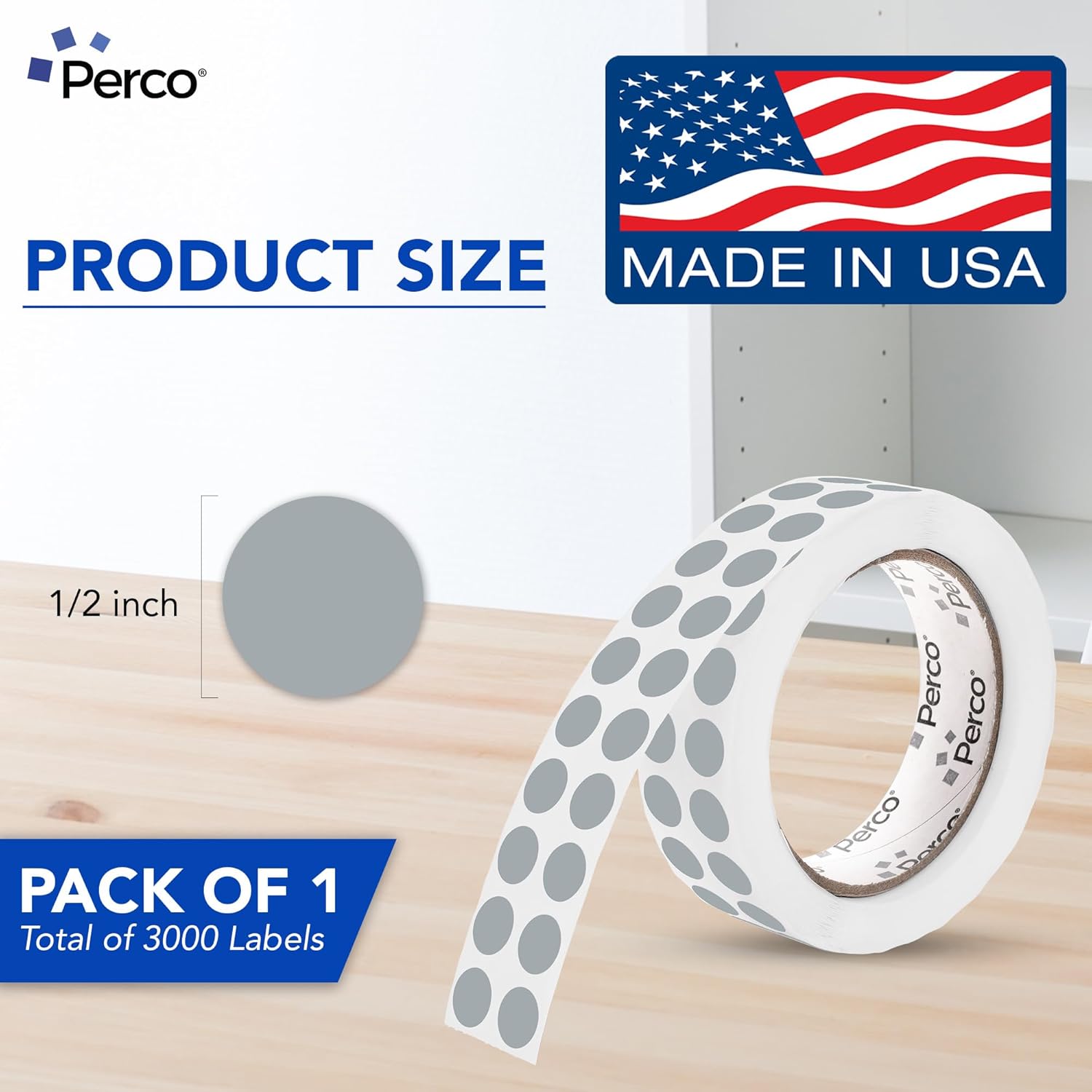 Perco Grey 1/2-Inch Round Circle Dot Sticker Labels with Easy Peel Perforation - 3,000 Labels per Roll - Strong Adhesion, Vibrant Colors for Organizing, Crafting & More - Made in USA