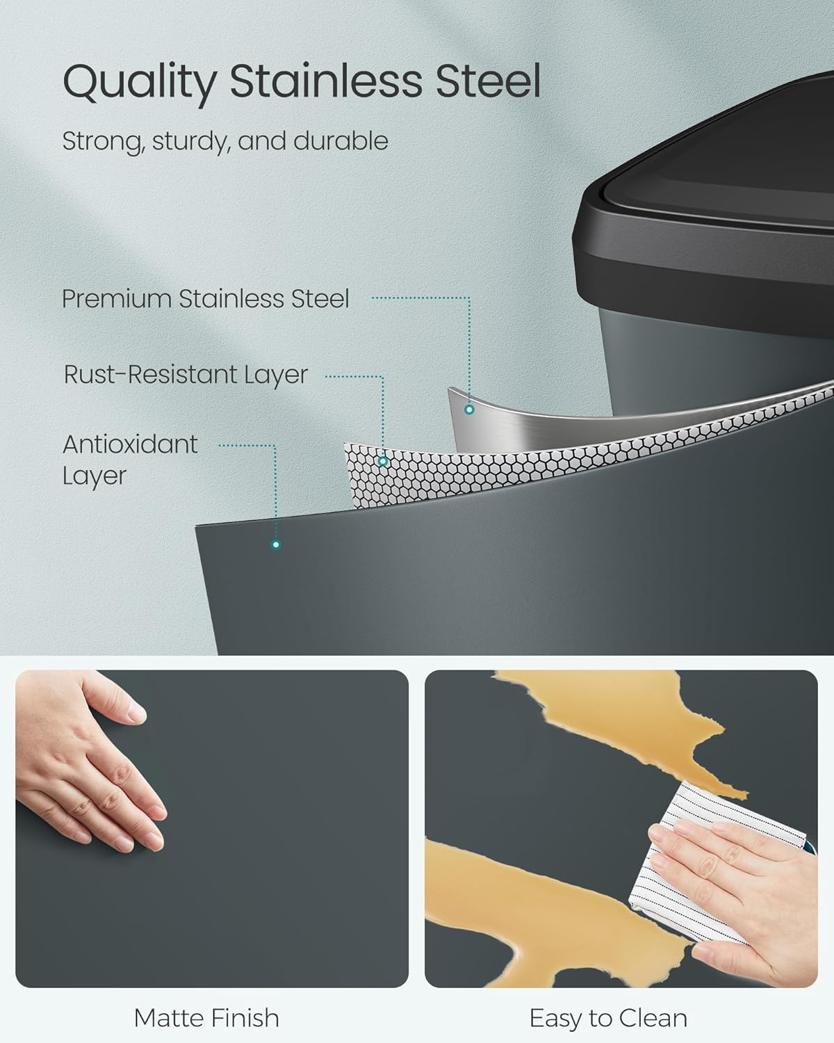 - [Quality Stainless Steel] Made from stainless steel, this trash can is rust-resistant and easy to clean. It adds a stylish modern touch to any kitchen