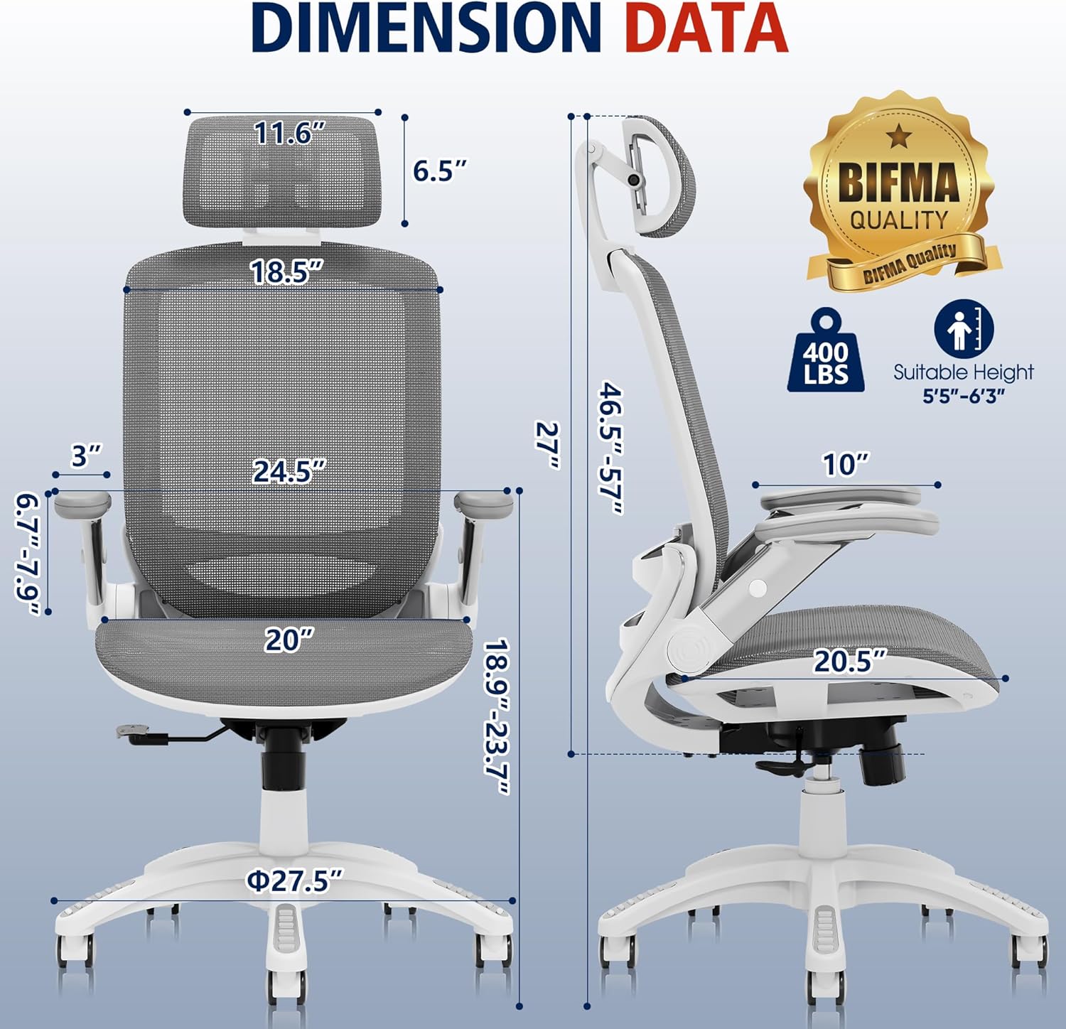 GABRYLLY Ergonomic Office Chair, High Back Home Desk Chair with Headrest, Flip-Up Arms, 90-120° Tilt Lock and Wide Cushion, 400LBS Mesh Chairs for Man Woman, White Task Chair(Dark Grey,GY01WDG)