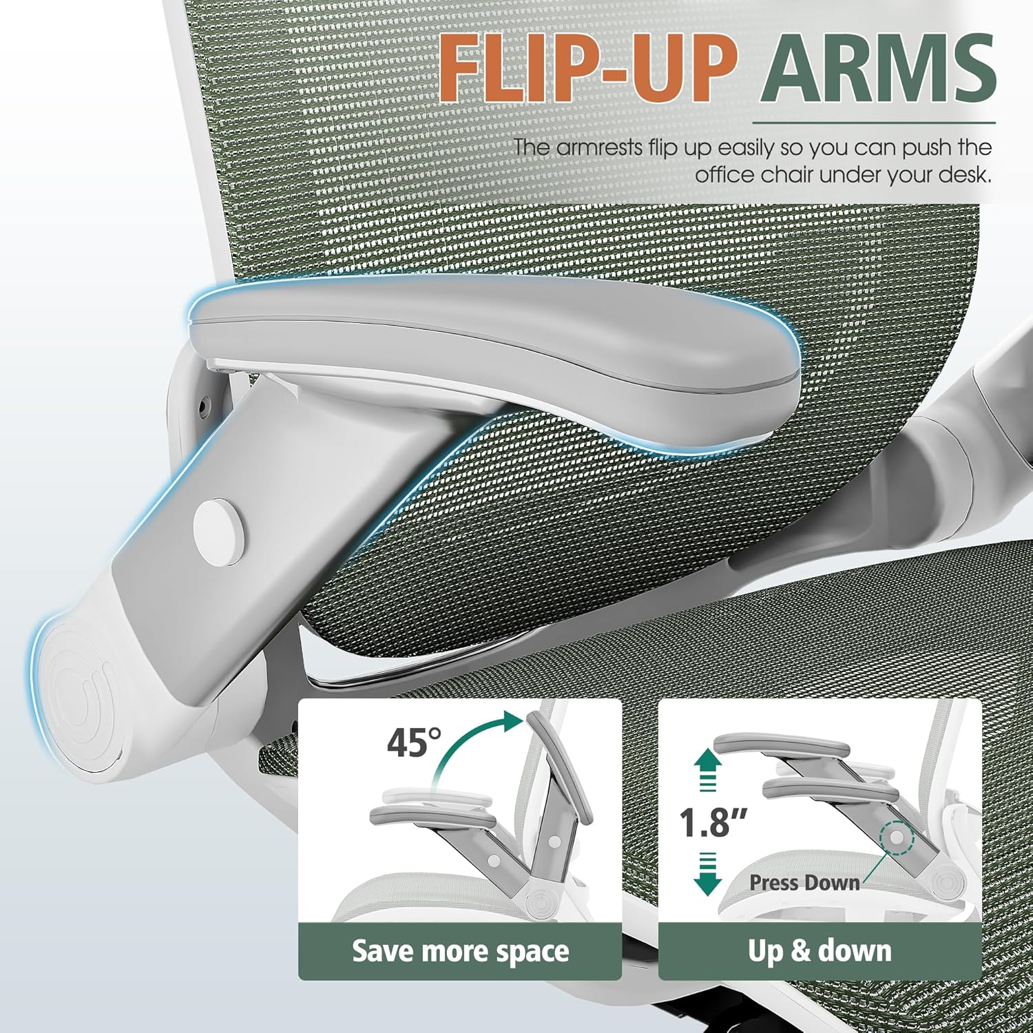GABRYLLY Ergonomic Office Chair, High Back Home Desk Chair with Headrest, Flip-Up Arms, 90-120° Tilt Lock and Wide Cushion, 400LBS Mesh Chairs for Man Woman, White Task Chair(Olive Green,GY01WOG)