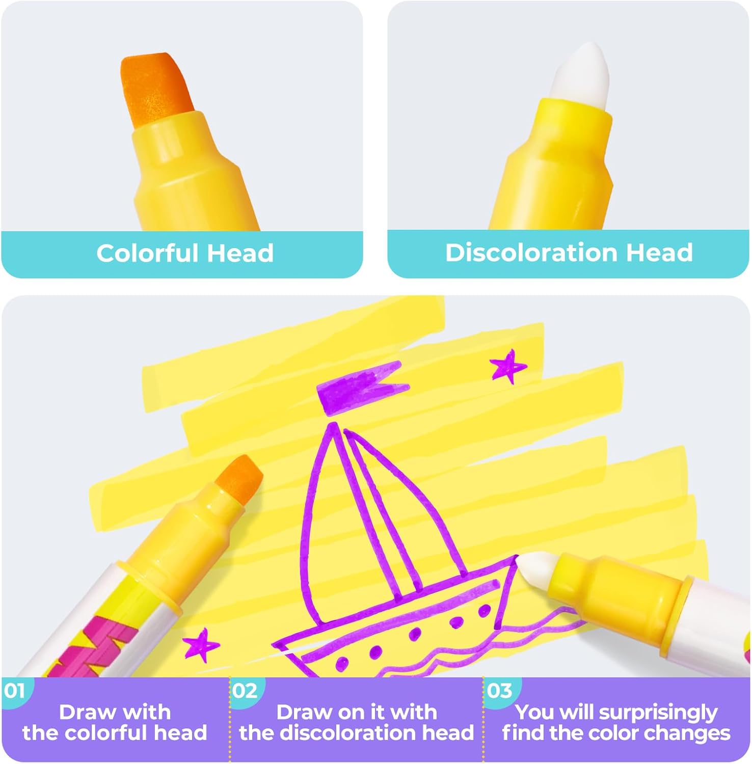 - 【EASIER TO CREATE DESIGNS】First color with the regular side of the joycat color changing pens, then use the white top to observe the color change. Differentiate from other color changing pens, our body of the pen come with color changing markers, making it easier for you to create and know the changing color before you draw.Watch your artwork go through a wonderful transformation and turn it into a creative activity that is exciting and engaging for kids of all ages. Color changing markers will double the fun when kids go back to school!