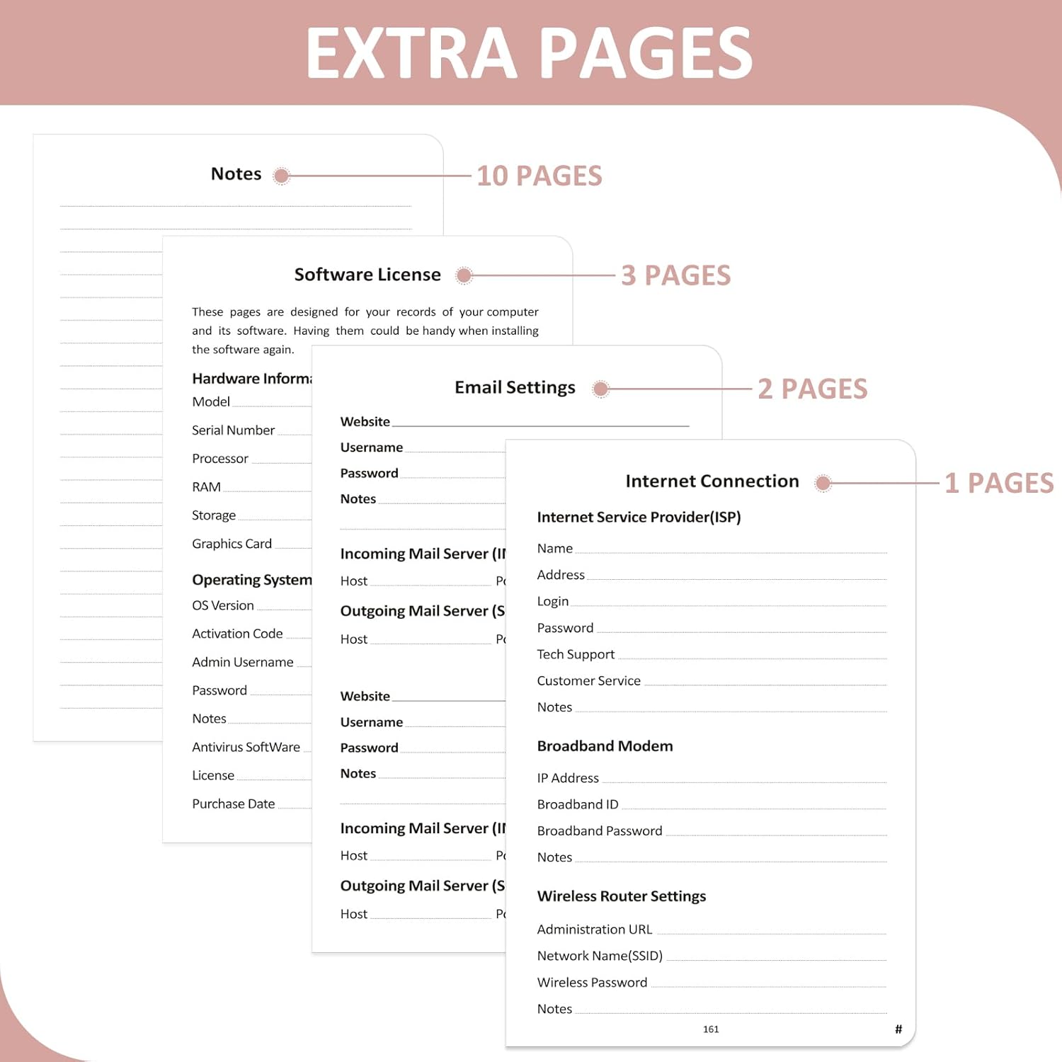 - Plenty of Space - The A5 password book has an amazing 624 entry spaces to record website login details. Each entry has a wide line spacing of 8mm and is combined with a large font. What's more, it adds extra pages for INTERNET CONNECTION (1 page), EMAIL SETTINGS (2 pages), SOFTWARE LICENSE (3 pages), and NOTES (10 pages).