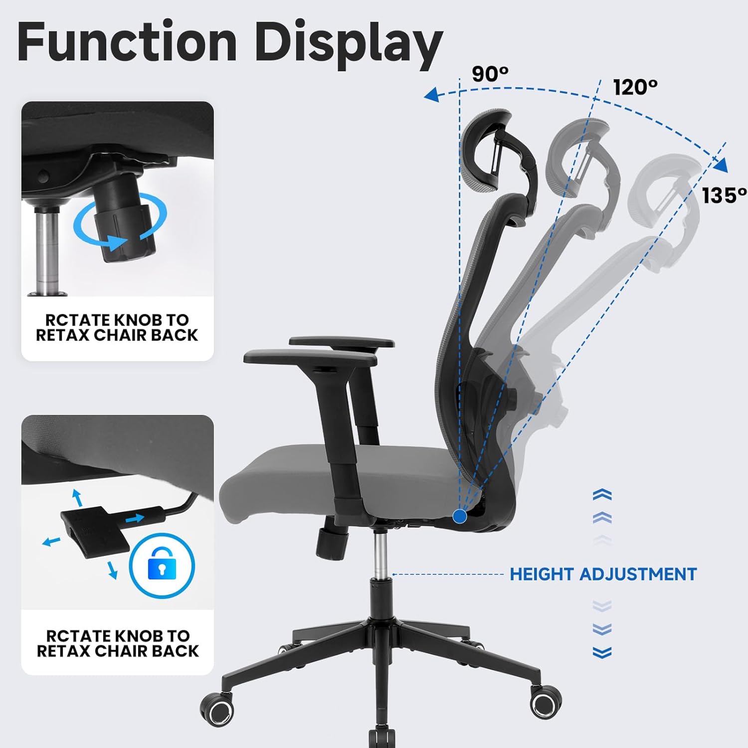 Ergonomic Desk Office Chair, High Back Home Computer Chair with Adjustable Swivel 3D Armrests for Comfort Lumbar Supports Up to 400lbs (Grey)