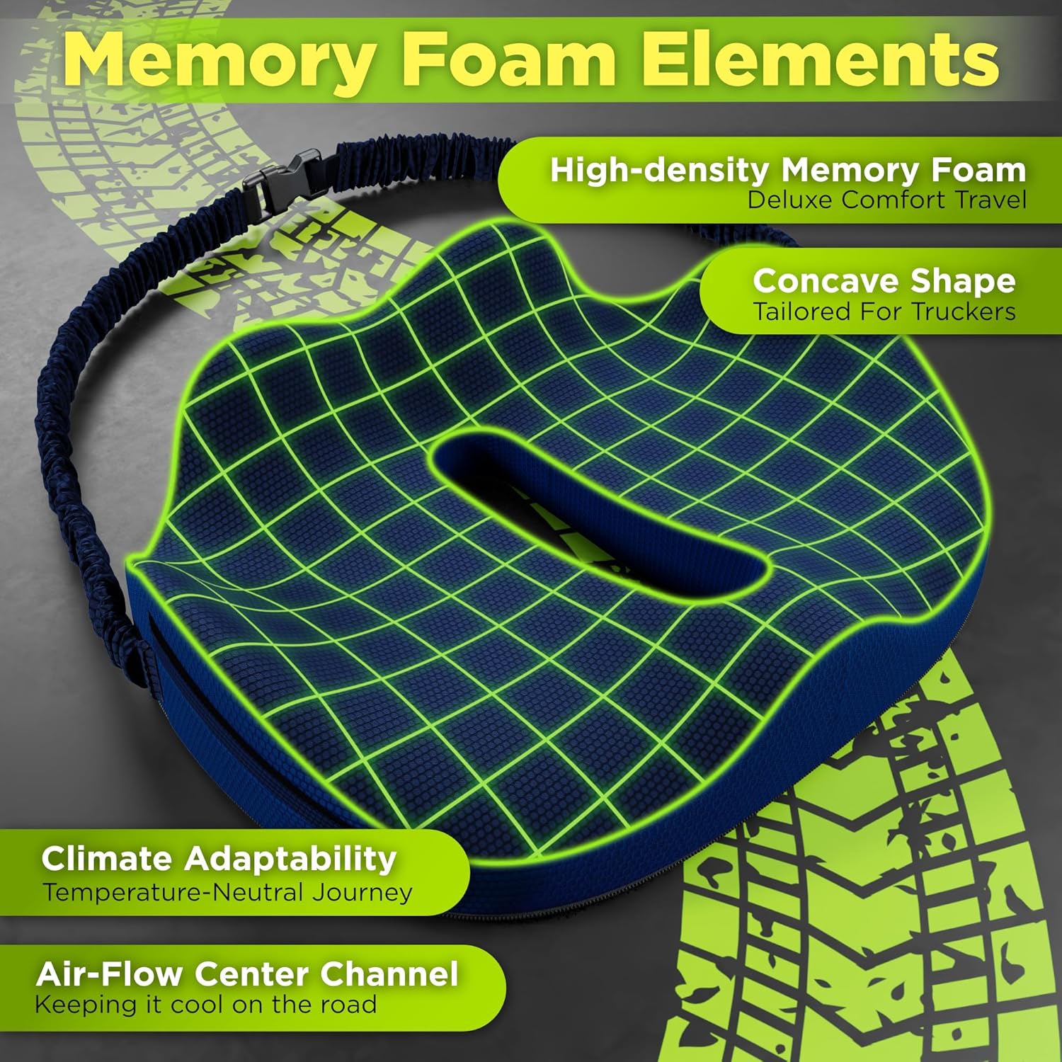 XL Truck Seat Cushion for Truck Driver Seat Cushion - Upgraded Back Support, CertiPUR-US® Certified - Thick Memory Foam, Pain Relief for Hours of Driving, Trucker Approved Big Rig - Navy