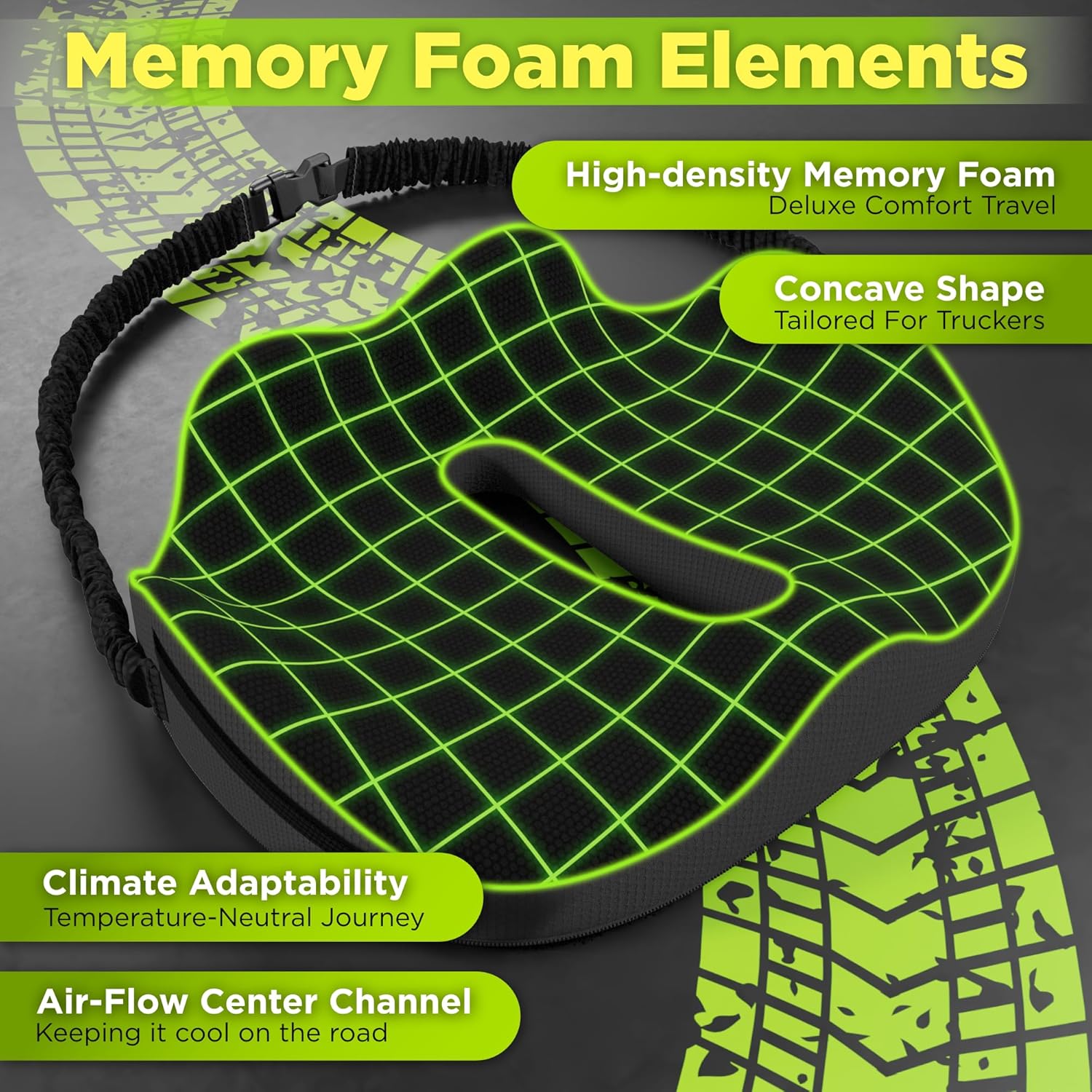 XL Truck Seat Cushion for Truck Driver Seat Cushion - Upgraded Back Support, CertiPUR-US® Certified - Thick Memory Foam, Pain Relief for Hours of Driving, Trucker Approved Big Rig - Black