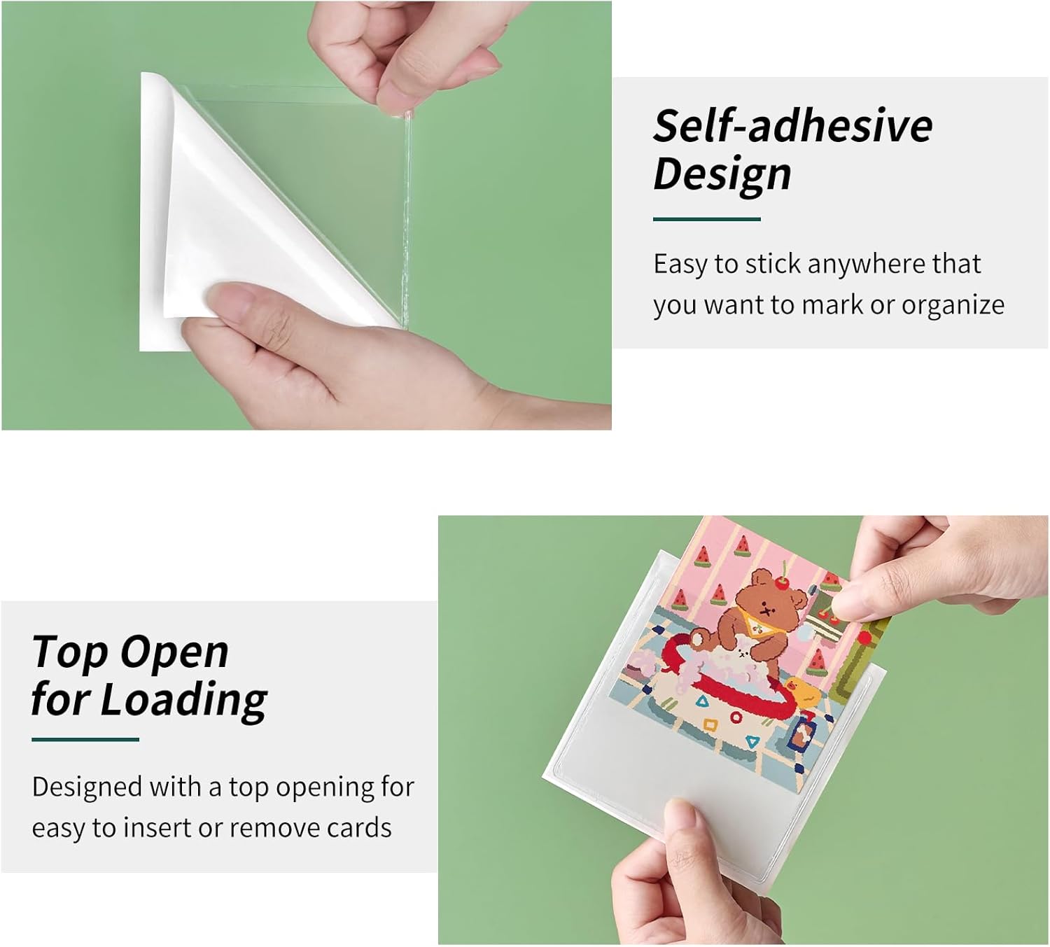 52 Pack Clear Adhesive 3" x 3" Index Card Pockets With Top Open, Plastic Card Sleeves Index Card Holder for Organizing Storage Bins, Library Cards, Notes, Drawer