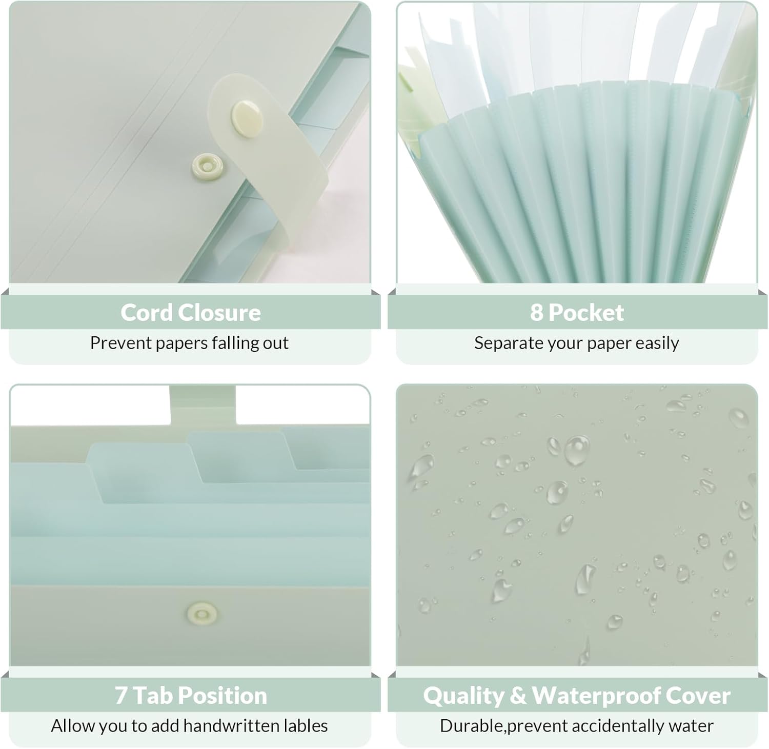 SKYDUE Expanding File Organizer with 8 Pockets, Accordion File Folders with Labels, Portable Document Paper Bill Receipt Organizer, Home College School Office Supplies, Letter Size,Light Green