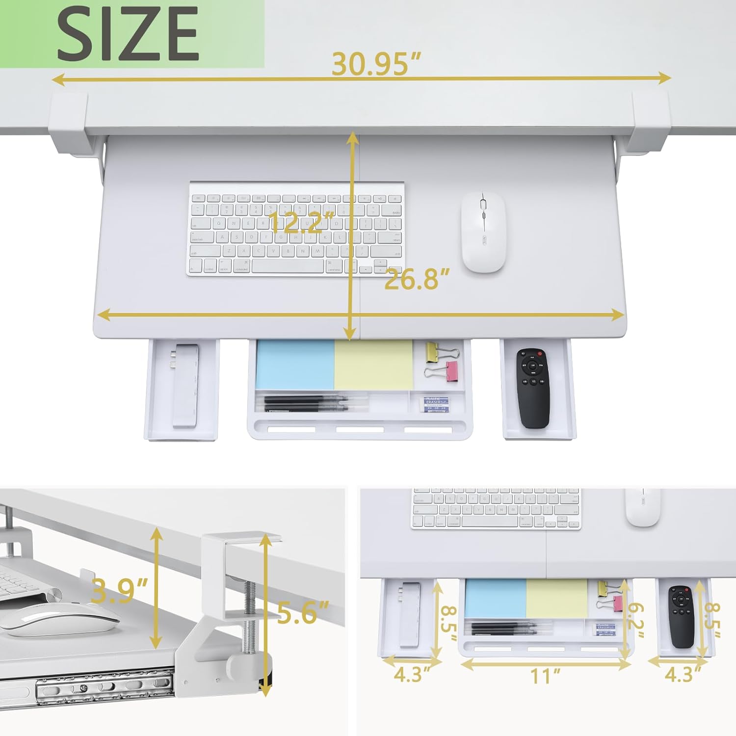 - Maximize Desk Space & 3 Drawers - The ETHU keyboard tray is designed to save desk space with its 26.77” (31.18" with clamps) x 12.2” size, allowing you to fit your keyboard, mouse, and small accessories beneath your desktop. Underneath the keyboard, 3 drawer storage adds valuable extra workspace for your phone and other items