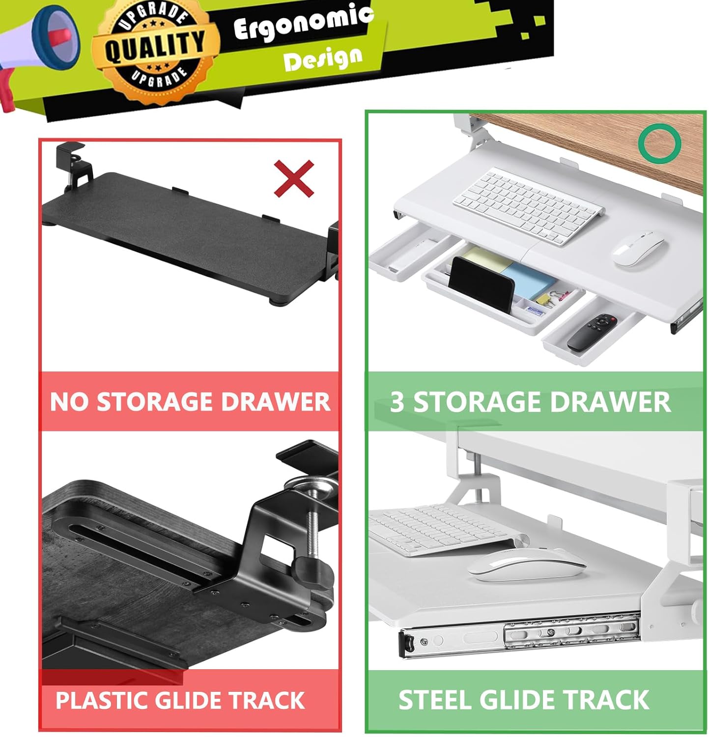 - Smooth Gliding Tracks - Retractable smooth sliding rail design allows the desk drawer to glide smoothly forward and backward. It encourages you to keep your arms and wrists in a neutral position and aids in the prevention of injuries caused by poor posture. Simply slide the tray under your desk when not in use and quickly pull it out when you need more space.
