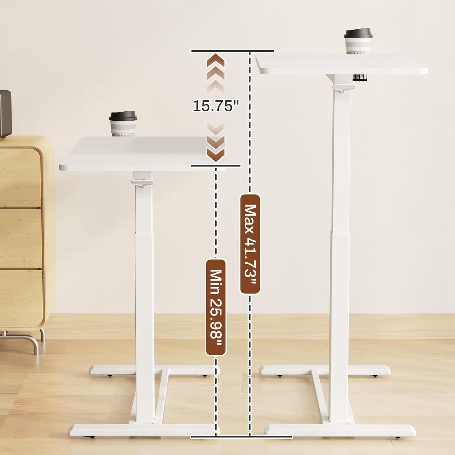 - Gas Spring Pneumatic Lift System : The sit and stand desk built-in gas spring offers smooth one-hand height adjustment from 26" to 41.7". No need to bend down or use force to adjust the height.