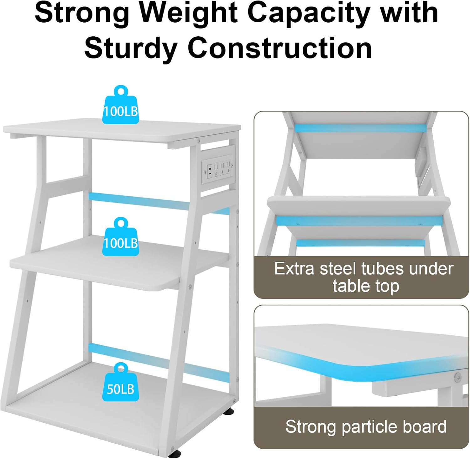 - 【Sturdy & Durable】The heavy duty printer stand supports 250 lbs in total. the powder-coated steel tube frame size is 1’’x1’’, and with extra load bearing tube under the top shelve , The solid construction,high quality particle board make it quite a durable printer shelf that you can count on for years.