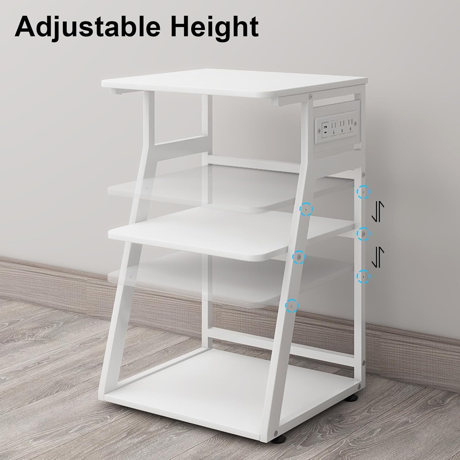- 【Height Adjustable】The middle shelf is height adjustable, 3 reserved holes with each distance of 4’’ for you to choose during installation, so you can adjust the space according to your needs, which will maximize the use of space of the printer stand for 2 printers.