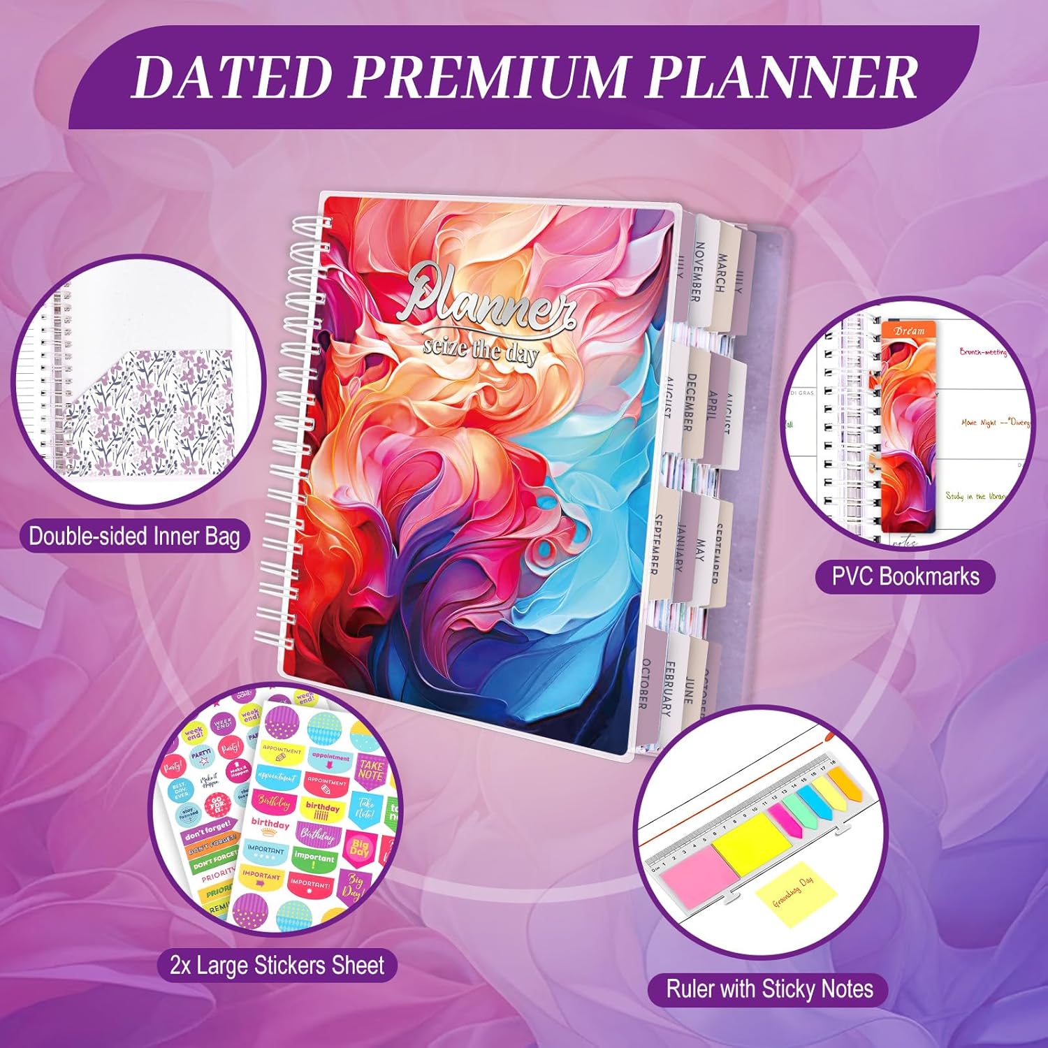 - 【Diverse Accessories】The 2025 large planner included practical accessories for office and school use: PVC bookmarks for easy page tracking, 175 transparent sticky notes, 79 large stickers, and a double-sided inner bag