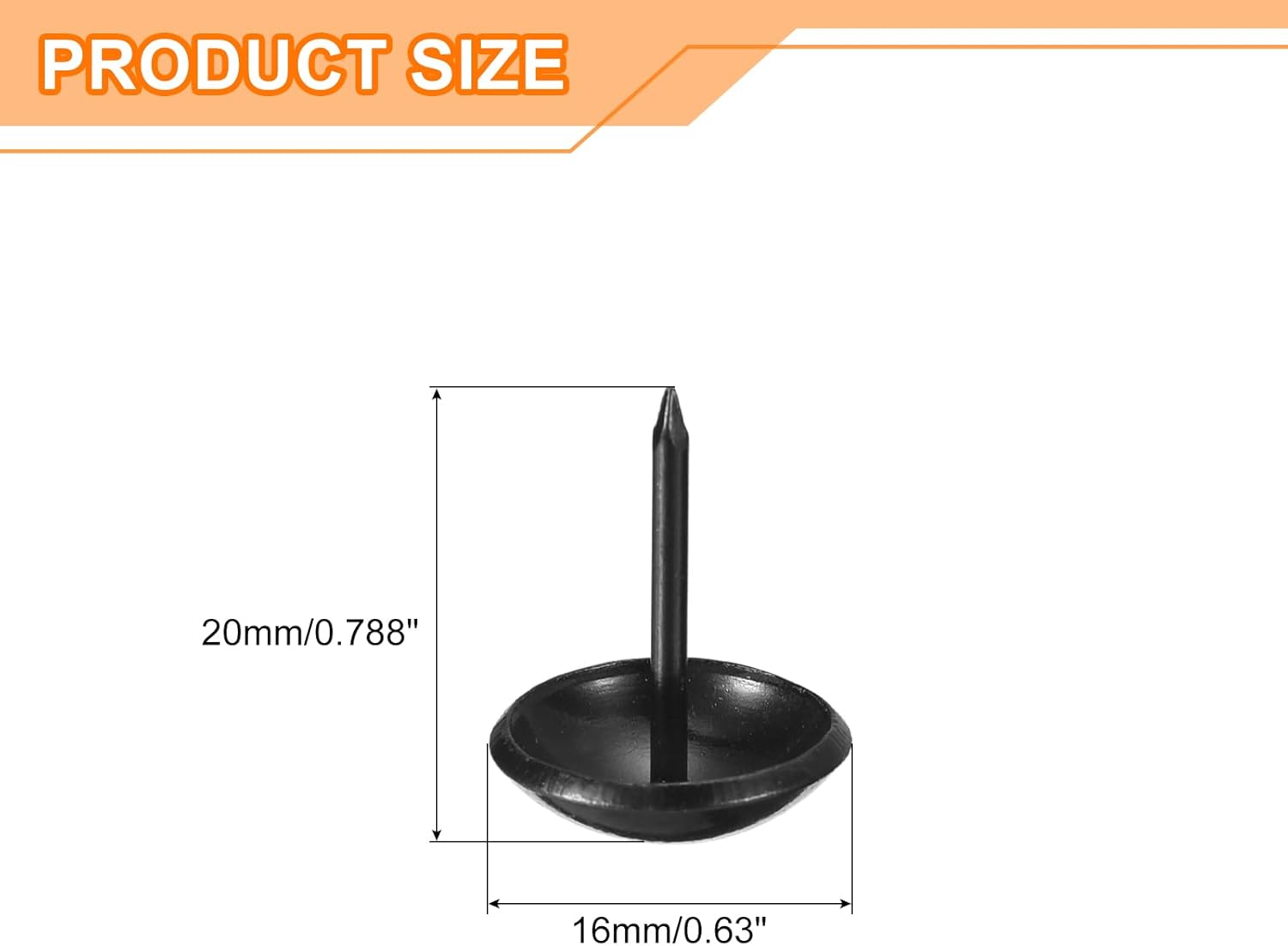 - Specifications: Material: Carbon steel; Color: Black; Diameter of nails head: 16mm/0.63inch; Shank length: 20mm/0.788inch; Package Content: 18Pcs x Upholstery Tacks Nail Pins