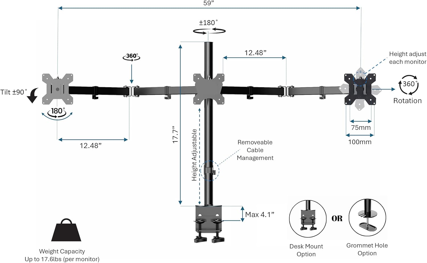 - Extra large electric stand up desk workstation - 46"x23.6" desktop work surface can hold three monitors up to 27" or two monitors up to 34"; 35"x10" keyboard tray can also hold a laptop, plus your mouse while keeping arms in an ergonomic position.