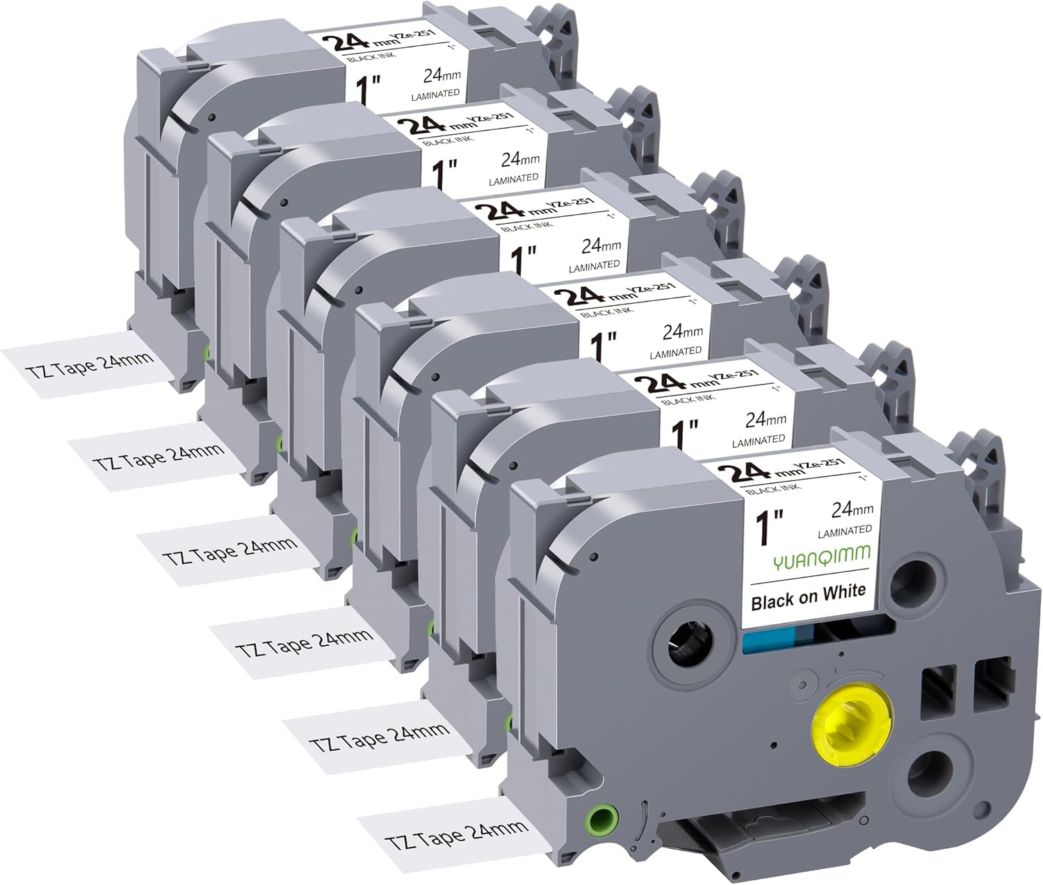- Package includes: 6-Pack YUANQIMM label tape Compatible with Brother Ptouch TZe251 TZ251 TZe-251 TZe tape 24mm 1 inch laminated white tape for Ptouch