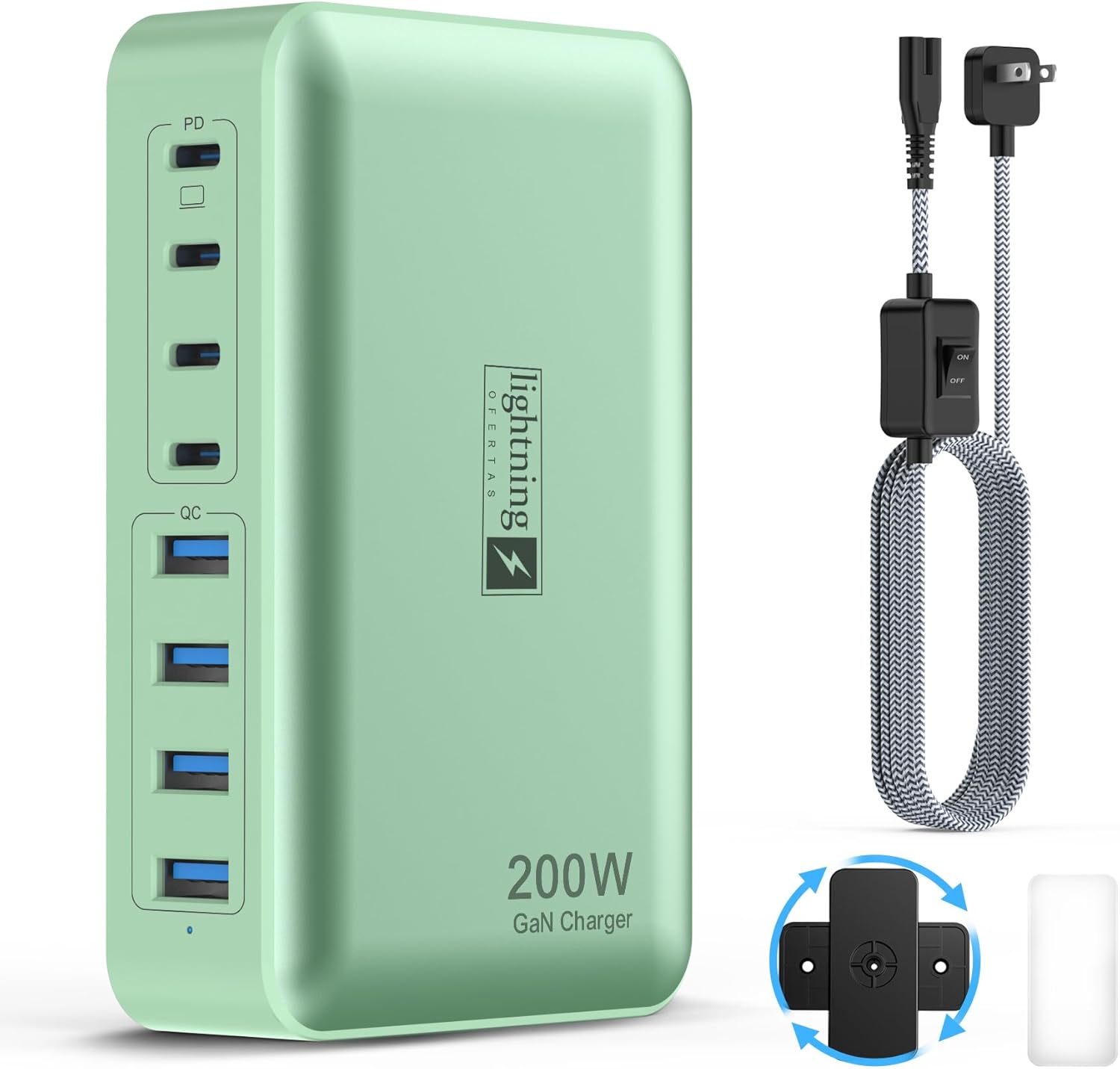 8-Port Multiple Charger Station 200W with Flat Plug, Braided Power Cord, and On/Off Switch- USB Charging Hub for iPhone, iPad, MacBook and More- 65W C Port Power Adapter for Laptops