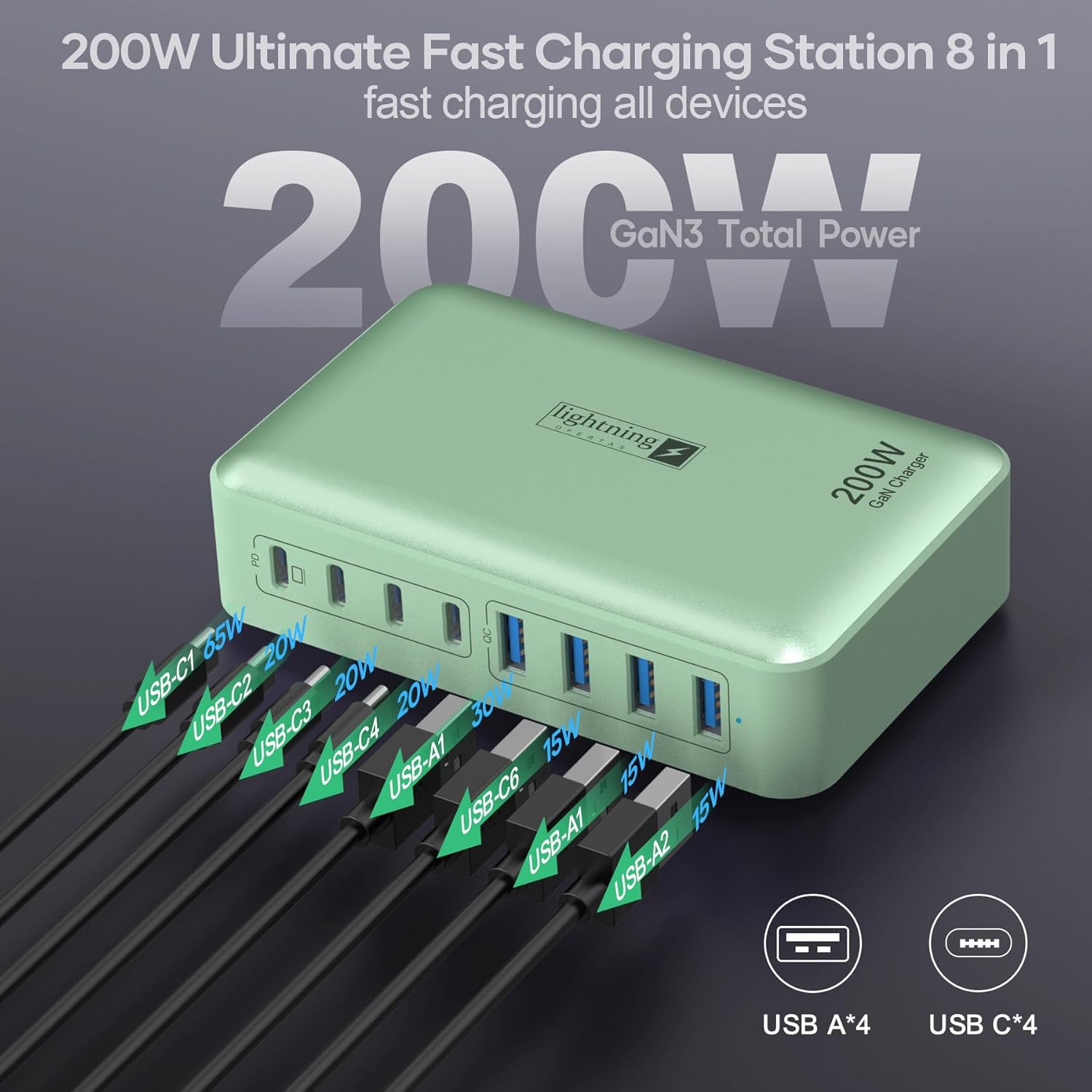 - Powerful 200W GAN charger with USB-C and USB ports, compatible with Apple, Samsung, and other devices.