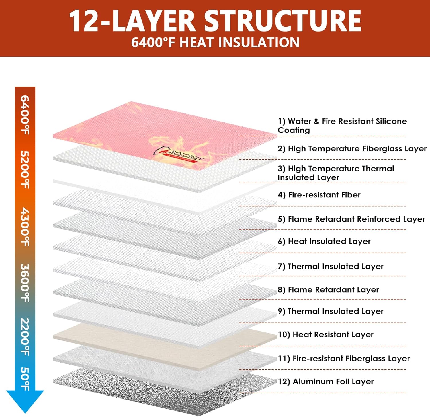 - [ADVANCED 12-LAYER FIRE PROTECTION]: Our fire proof bag for documents features an Enhanced 12-layer Structure, comprising a Silicone Coating Layer, Fireproof Fiberglass (x3), Flame Retardant Layer (x2), Thermal Insulation Layer (x5), and an Aluminum Foil Layer. It provides critical time to retrieve your items in the event of a fire. NOTE: The silicone-coated fiberglass surface may feel STICKY. If you are sensitive to STICKINESS, this product may not be suitable for you.