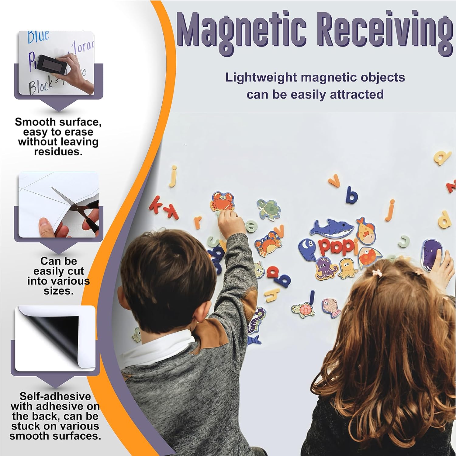 - Magnetic Receptive Surface: The self-adhesive dry erase whiteboard paper can double as a magnetic receptive surface, effortlessly attracting lightweight magnetic items. It's perfect for using magnets to secure notes, pictures, memos, calendars, etc., saving paper. You can stick it on any smooth surface like non-magnetic fridges, filing cabinets, or metal door surfaces