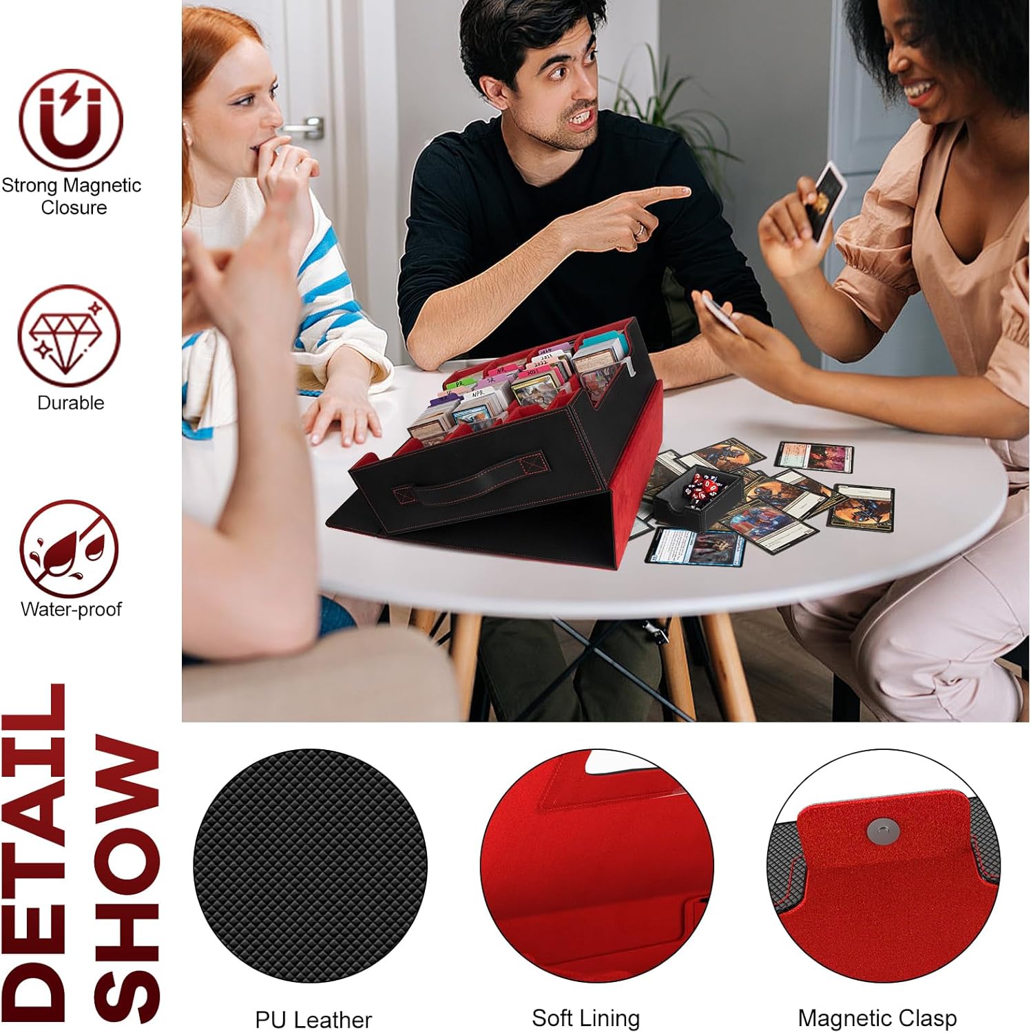 - Durable Quality - The magic card storage box is crafted from durable, water-resistant leather with a soft microfiber interior. This MTG deck box provides top-notch protection, keeping them safe from scratches, creases, and other damage. The box cover also includes a front window pocket with a free toploader holder (measuring 3.74 x 4.89 inches) where you can display your favorite card as the cover of the card collections