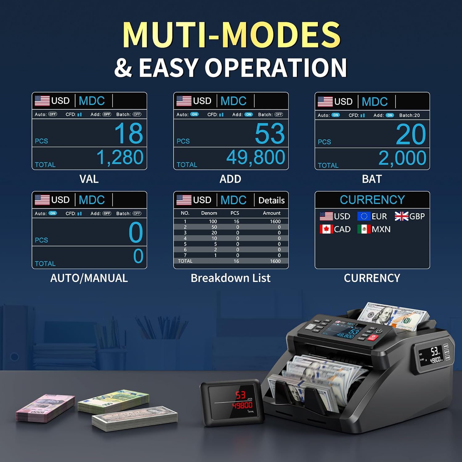 - Mixed Denomination Money Counter: Mixed Denomination Counting(MDC)/Single Denomination Counting(SDC)/Count The Number(CNT)/ Batch/ Add. In MDC mode, when currency is placed in the counting machine, the machine automatically recognizes the denomination of the bill and calculates the value and quantity of the bill. N70 supports USD/MXN/CAD/EUR/GBP (No counting of mixed bills).