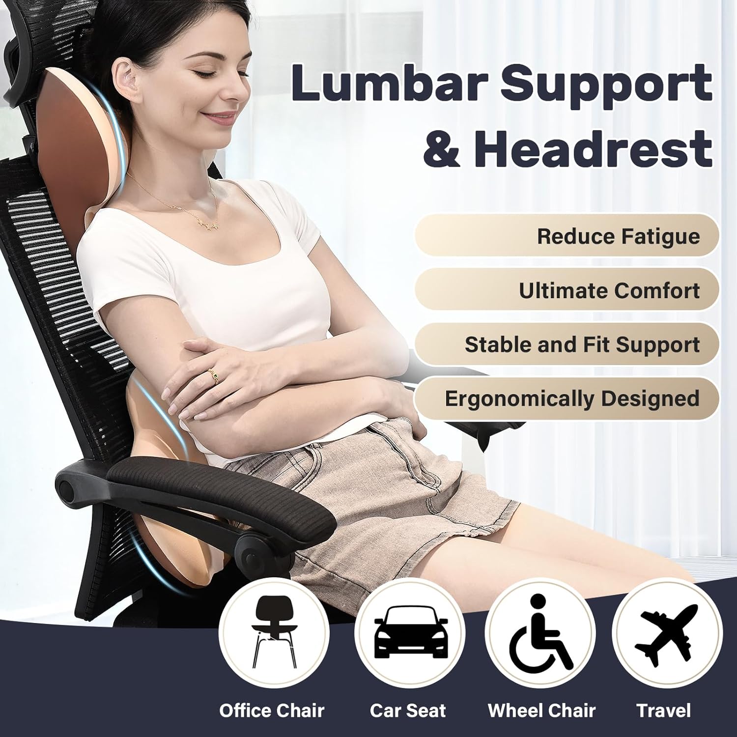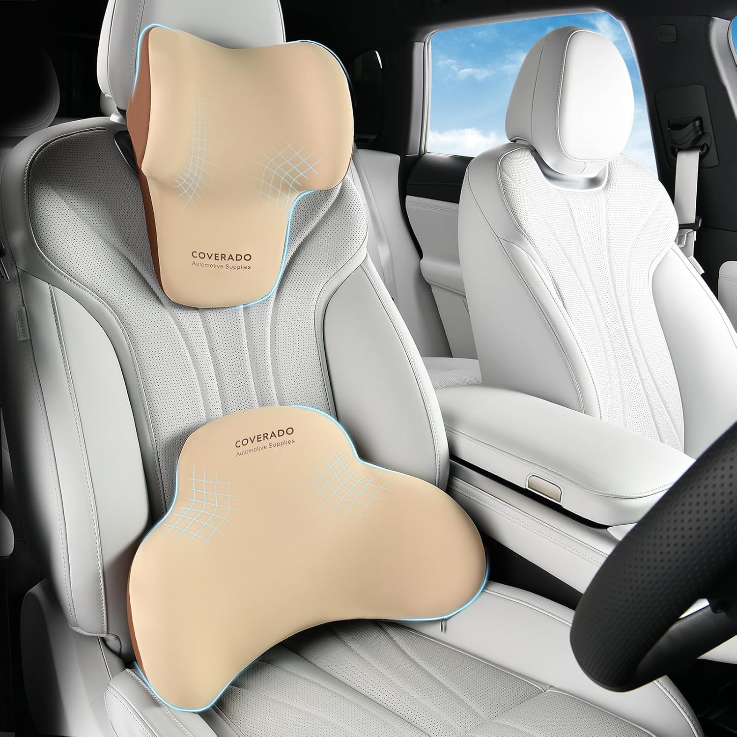 Coverado Lumbar Support and Car Neck Pillow, Ergonomic Memory Foam Desk Chair Cushion and Headrest Pillow for Car Office Chair, Sciatica & Neck & Tailbone Pain Relief Cushion-Beige