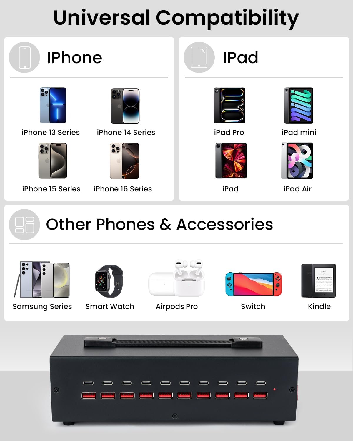 - Universal Compatibility: Designed for fast and safe charging, this multi device charging station is compatible with iPhones, Android phones, tablets, power banks, laptops, headphones, and other USB-enabled devices. Compatible for iPhone 15/14/13/12 Pro Max, iPhone SE, iPhone 11, iPhone X/XR/XS/XS Max, iPhone 8/7/6, iPad, iPad air, Table, Kindle, Sumsang Galaxy, Motorola, HTC, LG and more.