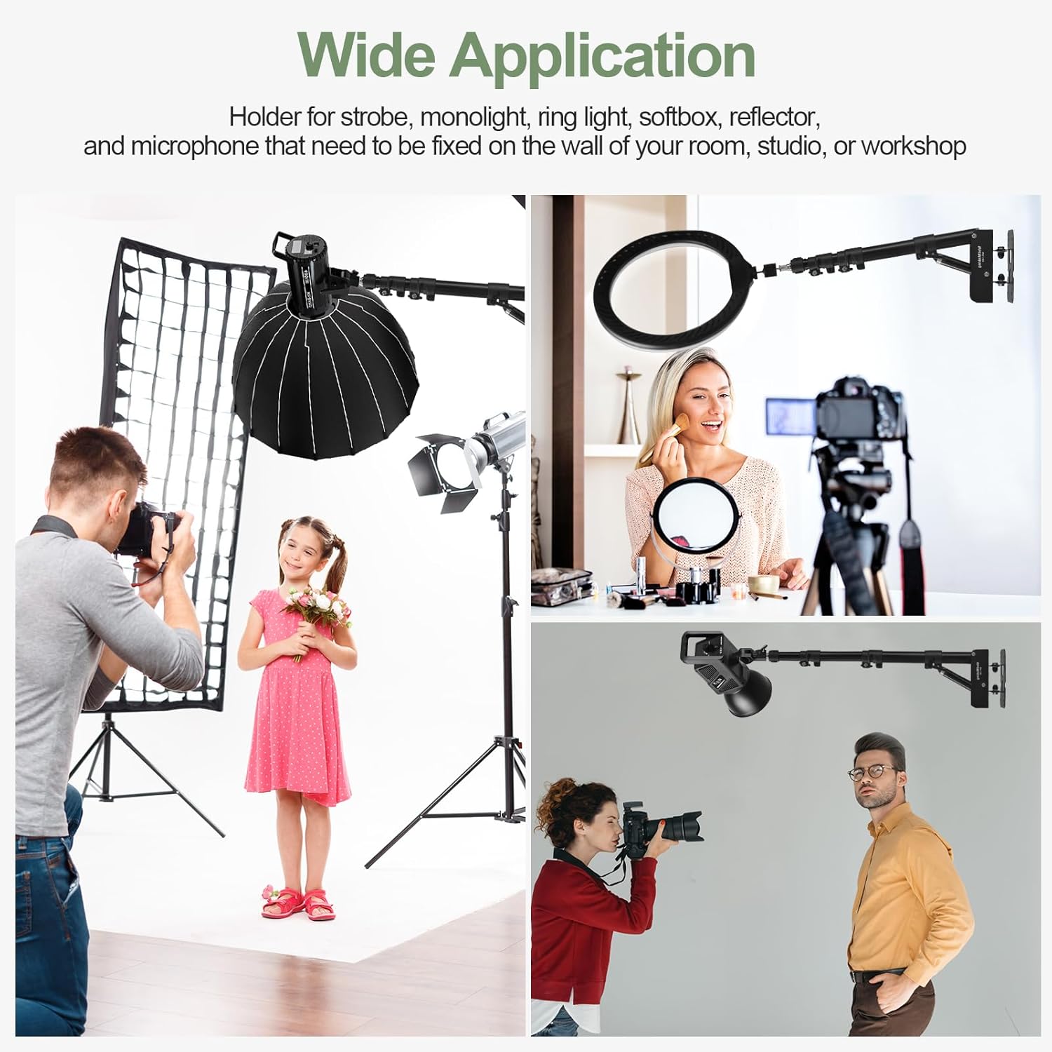 - 【Wide Application】 The wall mount ring light boom arm with 1/4'' and 3/8'' adapter screw is compatible with most equipment. It work well with LED video lights, Monolight, Strobe flash, reflector, microphone, camera, and all lighter-weight studio gear. Help in optimizing your studio space (Barbershop/Salon suite/Beauty Salon/Music studio/Photography Studio/Live Streaming, etc)