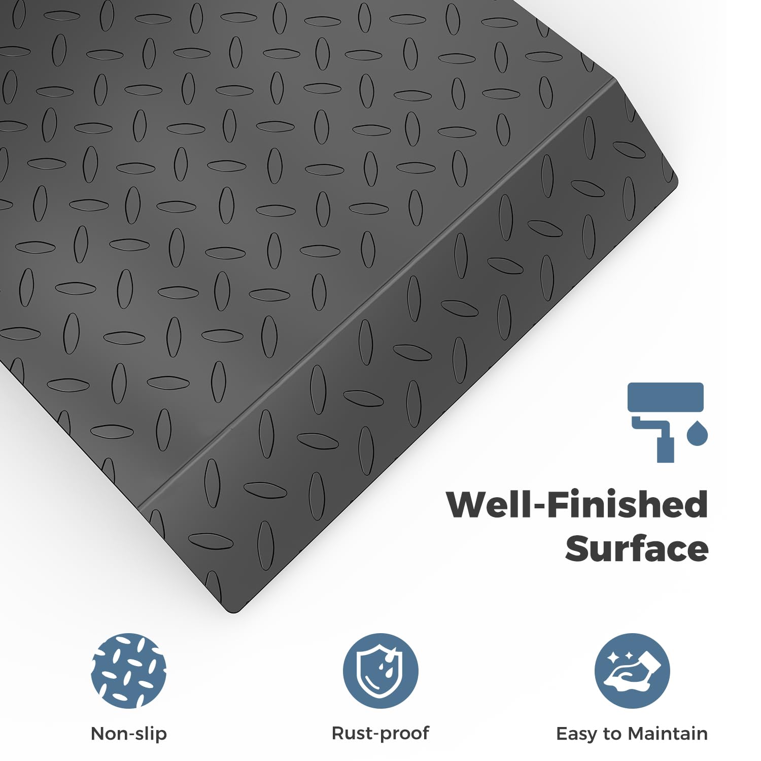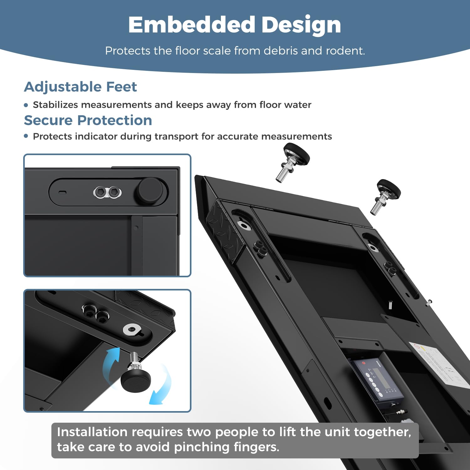 - 56.3" x 20" Carbon Steel Platform: This robust floor scale features a channel steel frame for exceptional stability. The diamond plate surface ensures that animals remain steady during weighing, while the well finish protects scale from dust and rust. The scale is equipped with four adjustable non-slip feet, allowing for easy calibration to accommodate various floor conditions. Additionally, the embedded weighing sensors are designed to keep from debris and rodents.