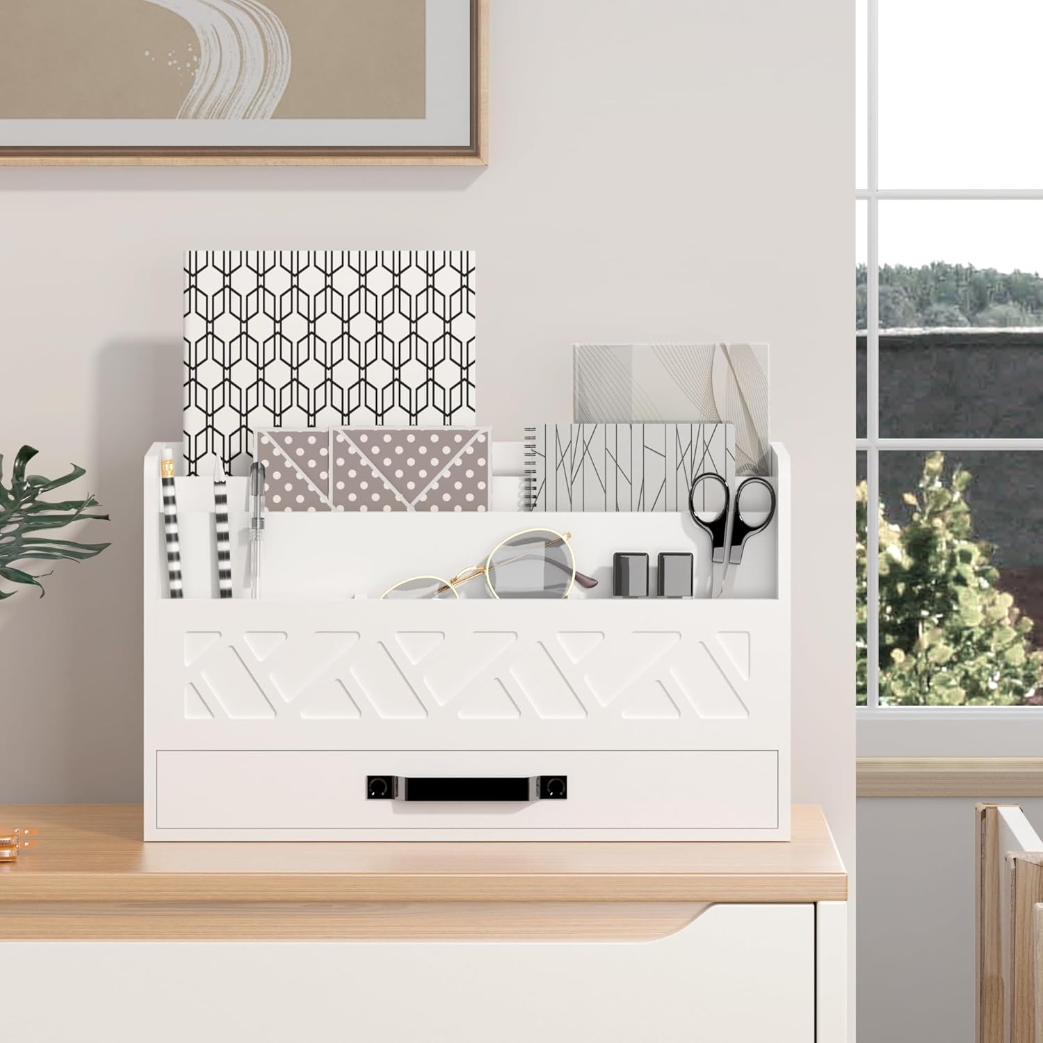 - Stylish office desk organizer: Upgrade your workspace with this stylish desk organizer, enhanced with gold mental drawers perfect for desk organization and file storage, With its sleek design for all your desk accessories, this desktop organizer is not only functional but also adds a touch of sophistication to any home office or work desk.