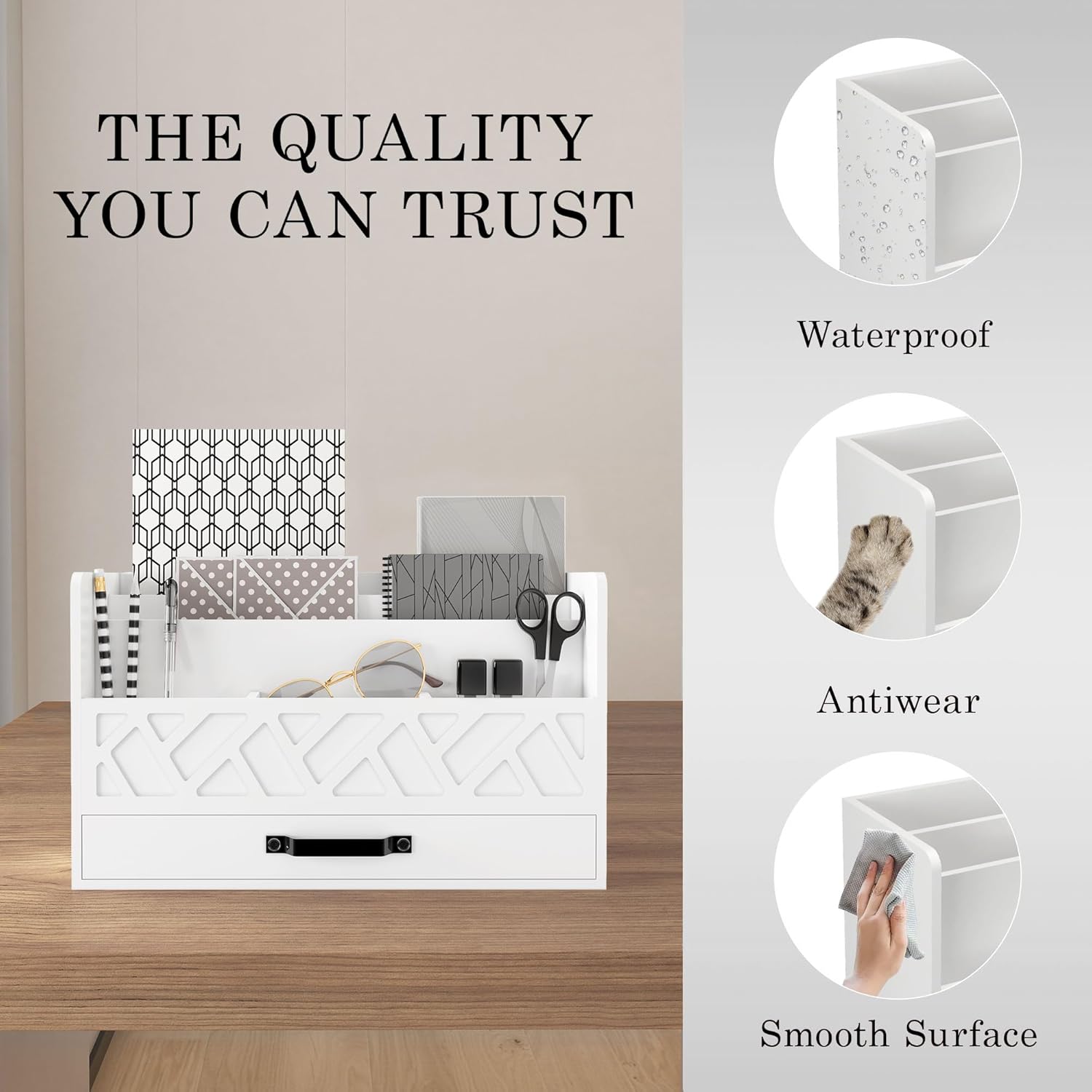 - Small Drawer organizers :This bamboo desktop file organizer has a large capacity and different storage areas.Additional storage for your files, letters, magazines, pens, stamps, paper clips and more for your office desk organization! Also you can use the drawer as a key holder or Pencil holders.