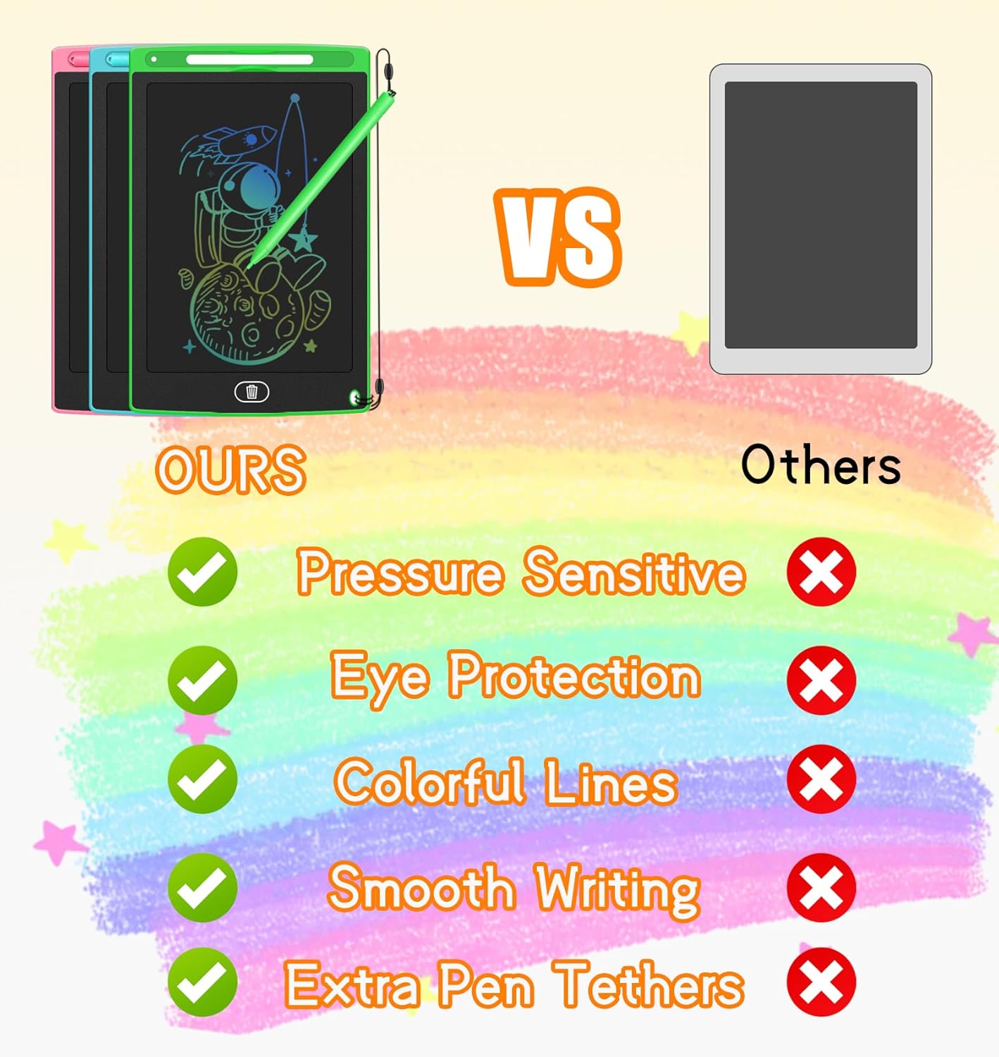 - Multi-purpose: Protect your children's eyesight with our no radiation LCD drawing tablet. No paper waste on the drawing board. No damaged walls by crayons or markers. Equipped with a string to prevent the stylus from being thrown around.