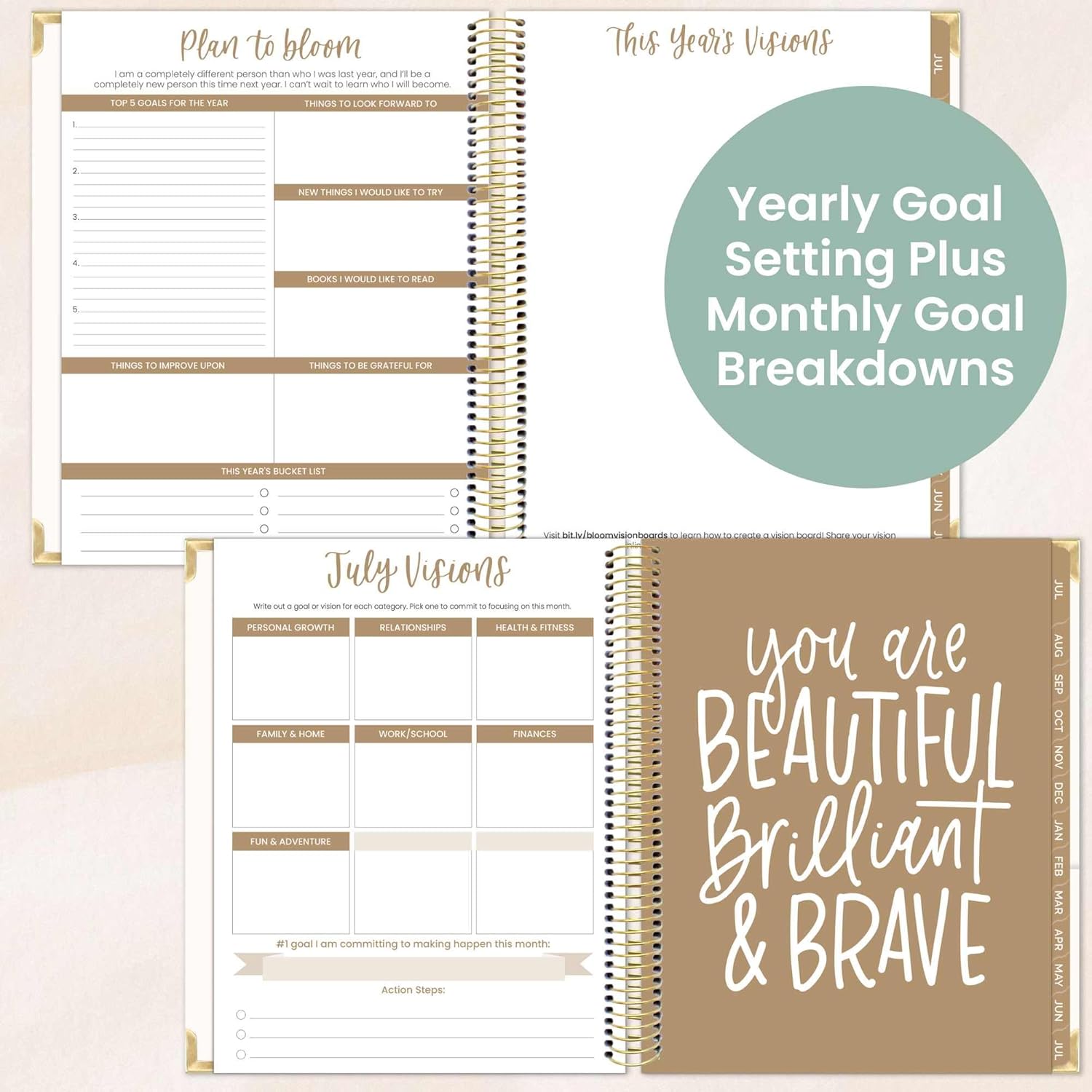 - ADDED BONUSES TO HELP YOU BLOOM: Stay on track with tools like a personal mission statement prompt, streamlined monthly vision boards and weekly action planning, a monthly budget and bill tracker, habit tracking sheet, 4 notes pages, and more!