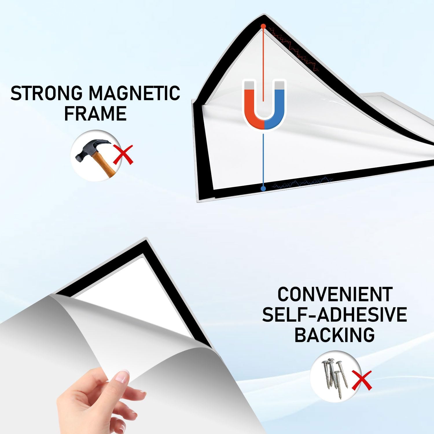- Magnetic Frame: The magnetic sign holder features two durable PVC sheets and laminated magnet strips. Its strong magnetic attraction secures the poster, and the fully sticky back ensures stability. The transparent sheet clearly displays the poster