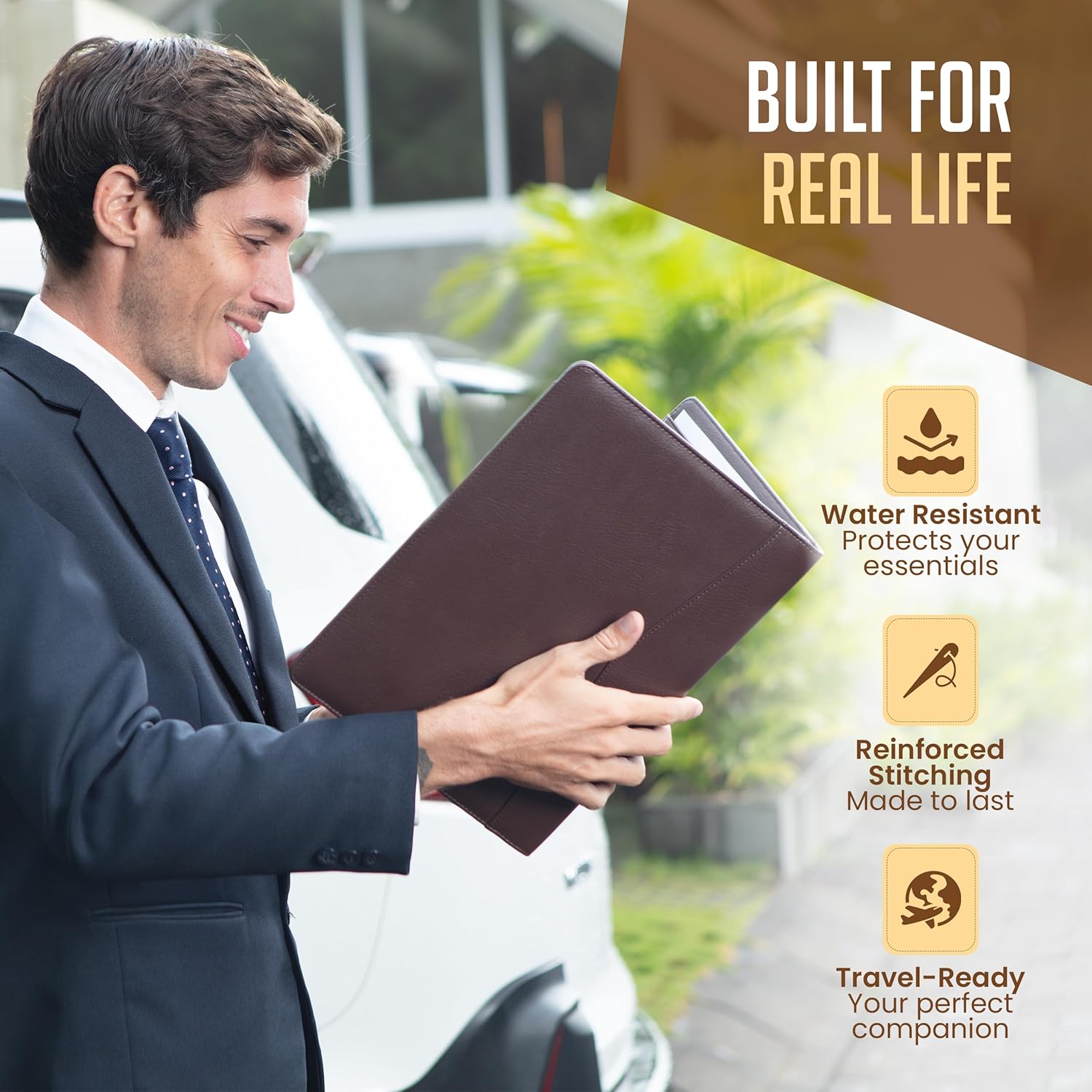 - ✅ STYLE MEETS FUNCTION – Elegant design featuring convenient, safe pockets ideal for documents, business cards, travel tickets, pitch proposals & resumes. Includes a pen holder & refillable writing pad