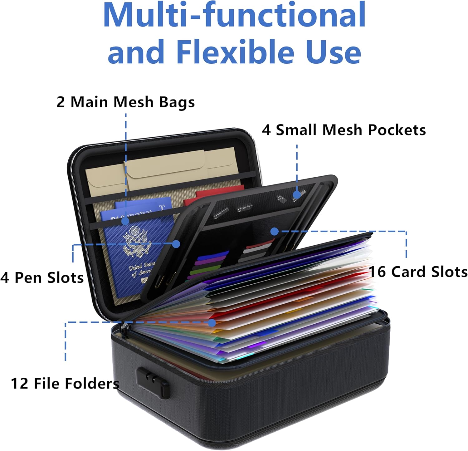 - Spacious and Smart Important Document Organizer: Built for busy households, this safe box fireproof waterproof features 12 file folders, 2 main mesh pockets, 4 small mesh pockets,, 16card slots, and 4 pen loops for classifying medical forms, legal contracts, school recor
