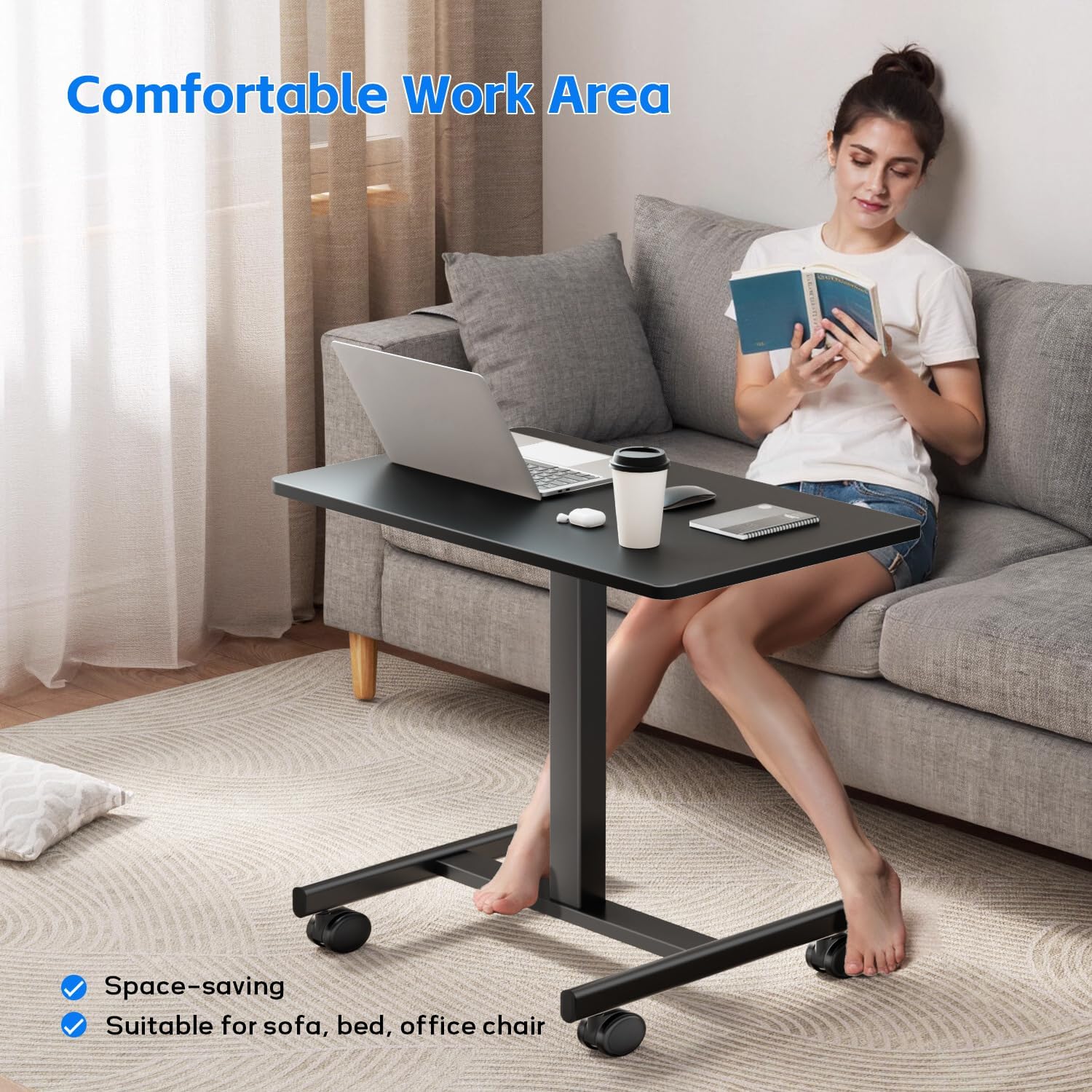Mobile Small Standing Rolling Desk Adjustable Height, Portable Laptop Desk on Wheels, Workstation for Home Office with Hook, Black